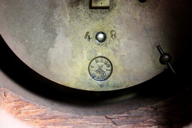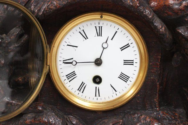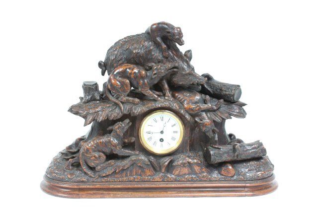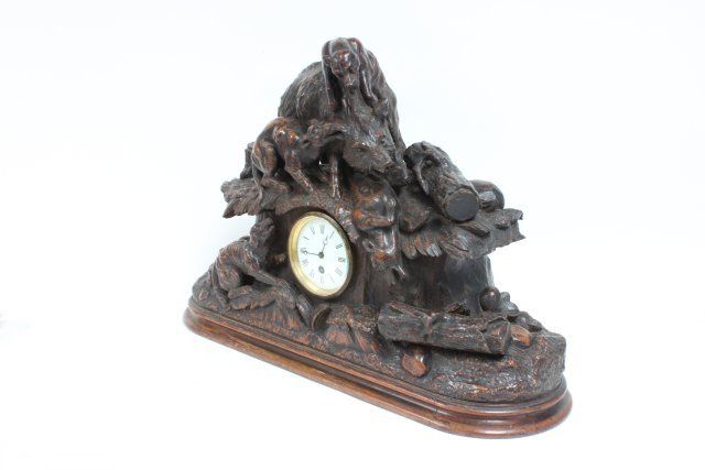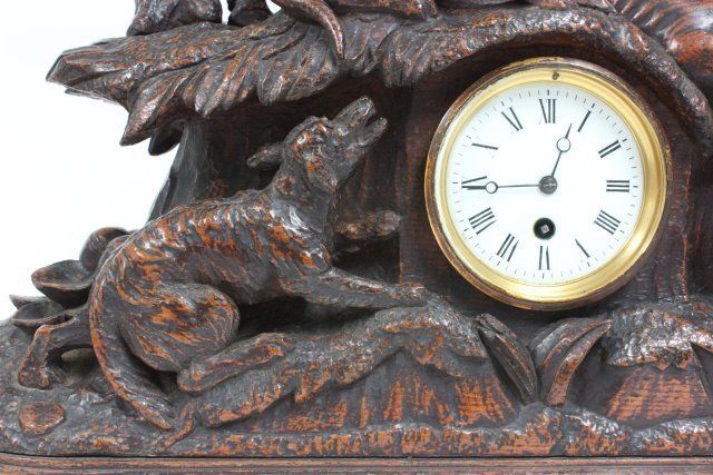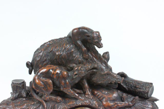 S. Mirt Black Forest hunting scene clock with pendulum. "Dogs and Boar." Approx. 18" H. X 24" W. Dog missing ear.