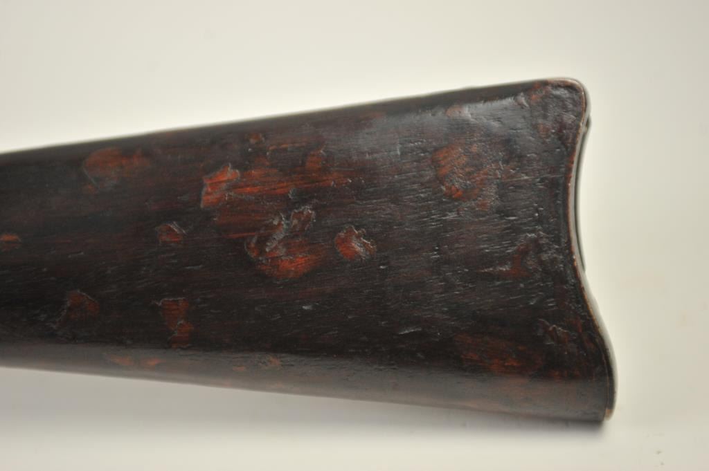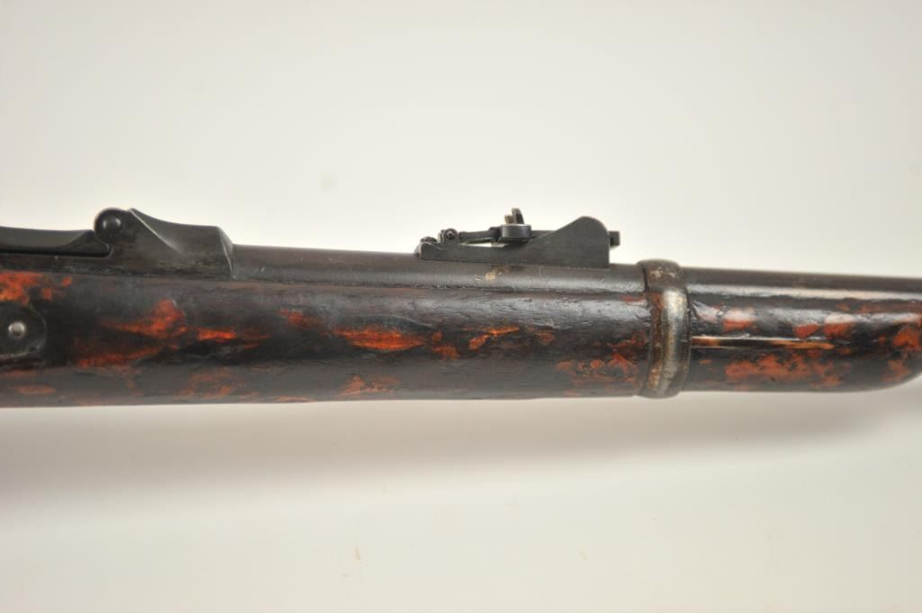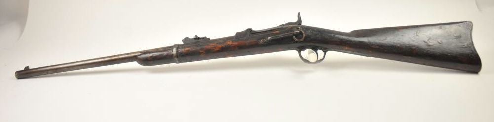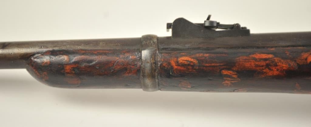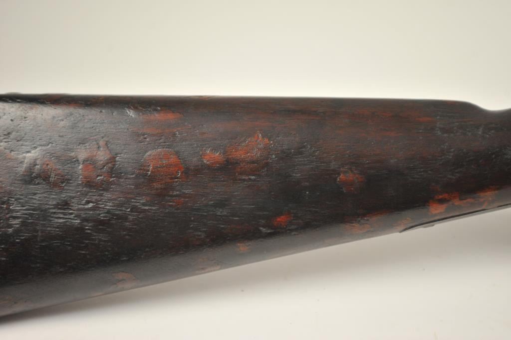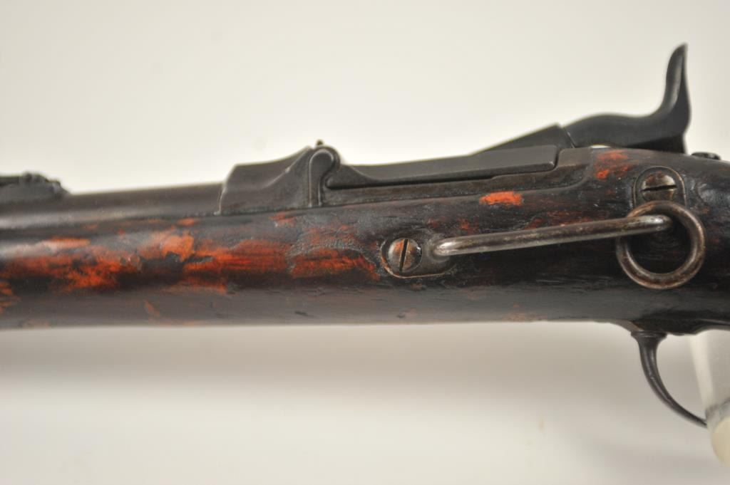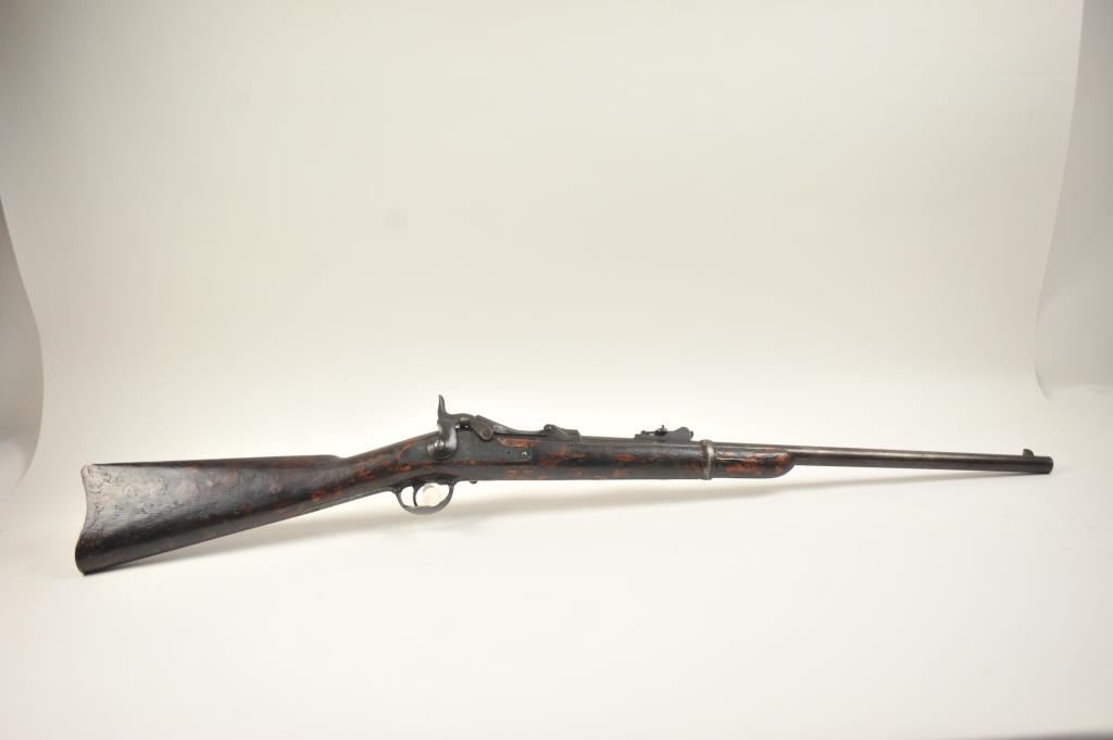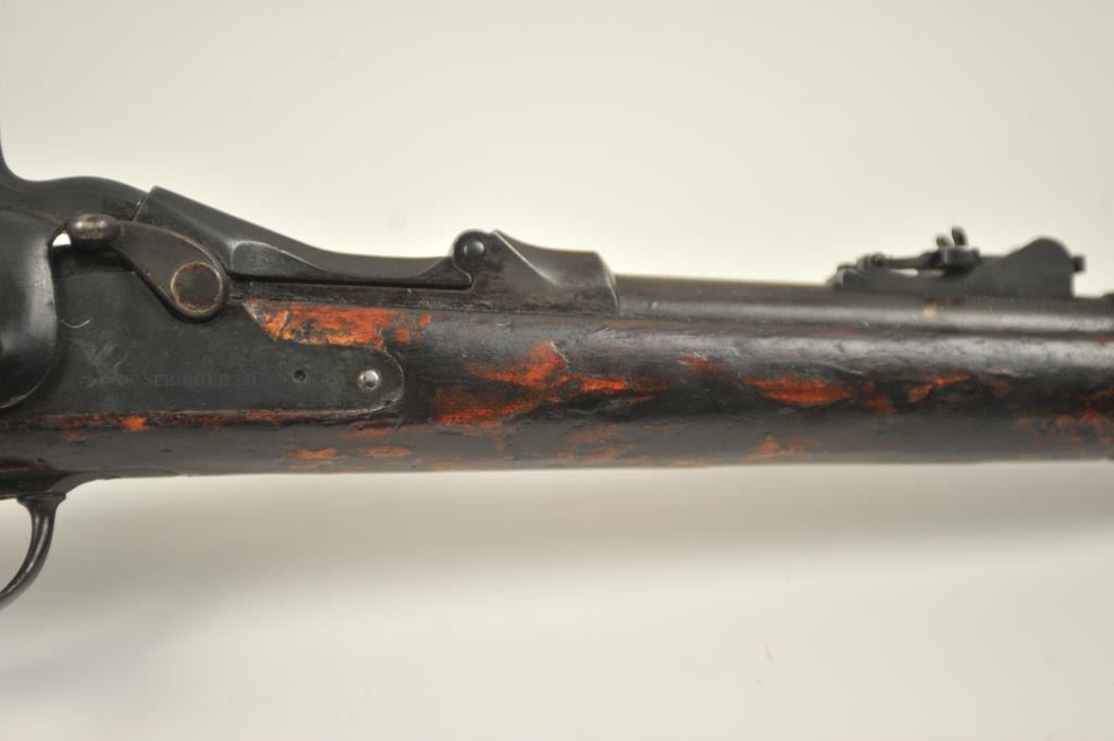 .S. Model 1884 Trapdoor Springfield carbine in .45-70 caliber, Serial #379767 showing mottled Indian style red ochre paint and evidence of having been wrapped in a blanket, which removed finish and texture. Allcorrect carbine features and small parts. Traces of blue in smooth brown patina. Good lock markings, the bore is worn from extensive firing. This gun is just the way collectors like to find them and only 14numbers off a documented 10th Cavalry “Buffalo Soldier” ID’D carbine. Est.: $700-$1,400. (Antique).