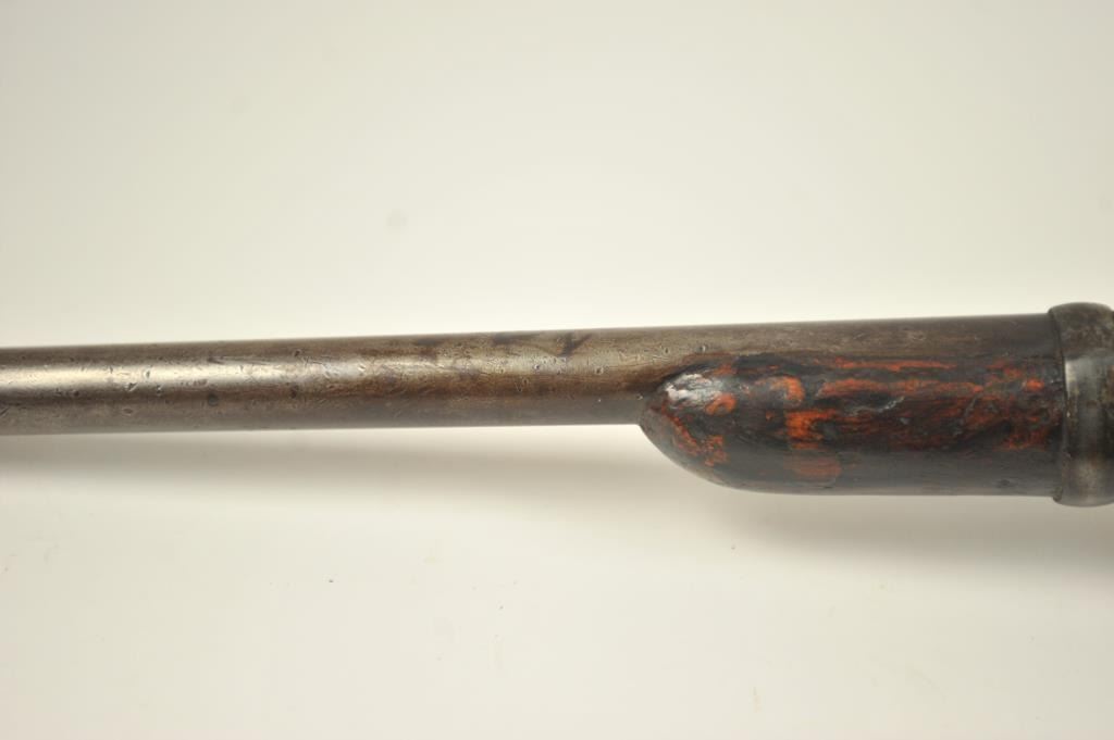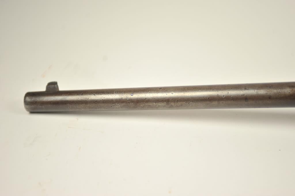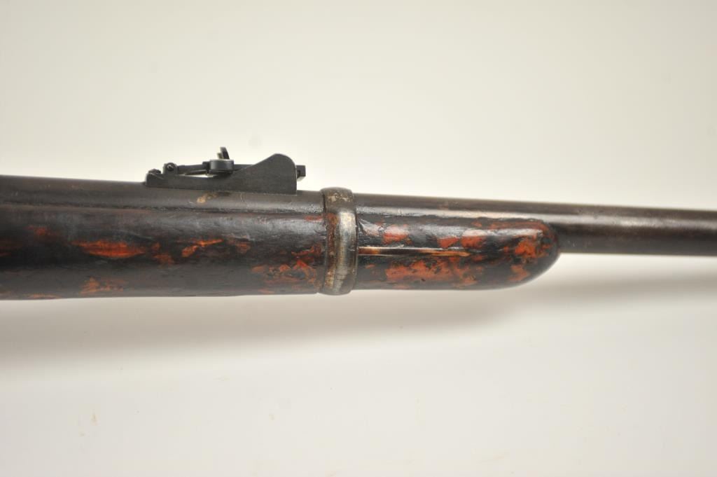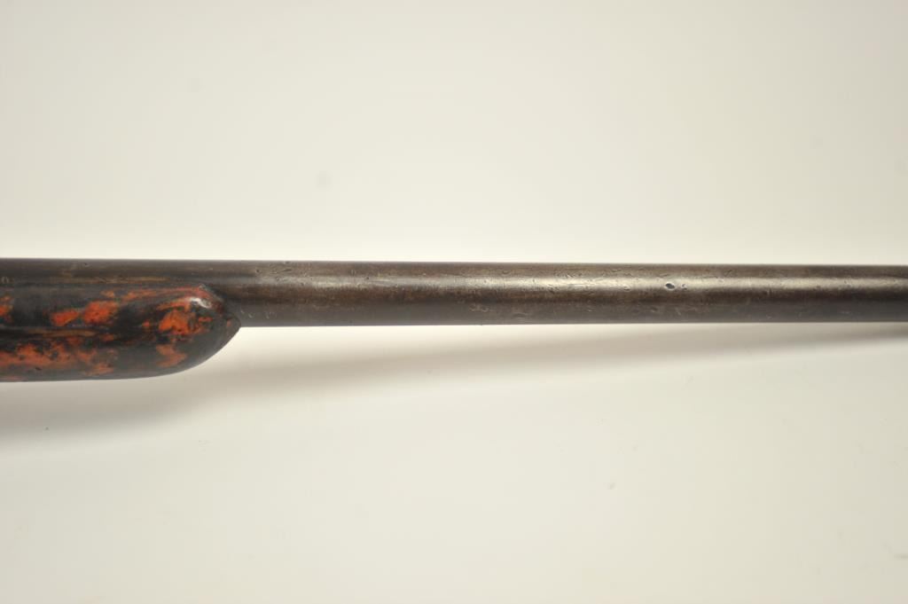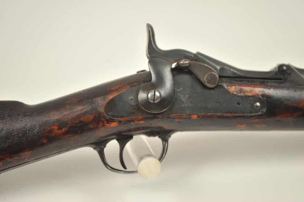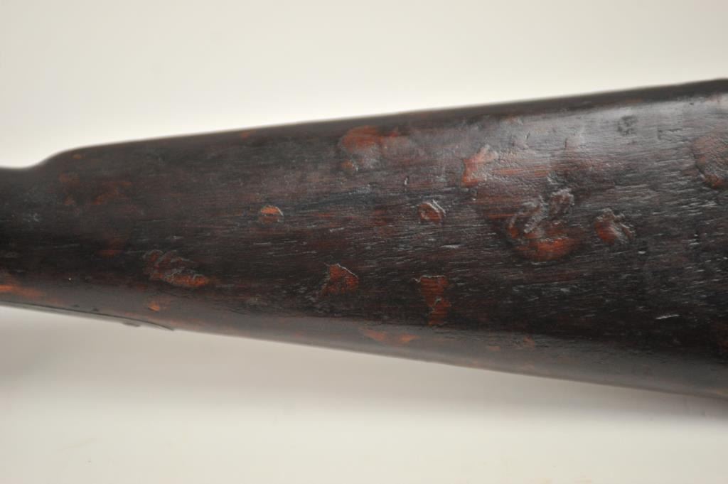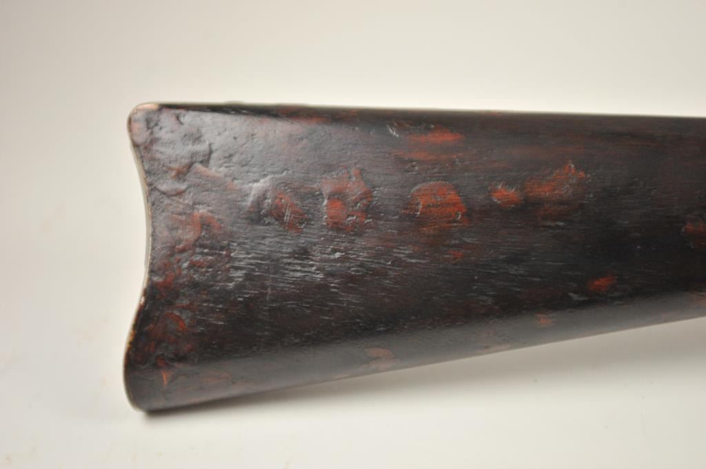 .S. Model 1884 Trapdoor Springfield carbine in .45-70 caliber, Serial #379767 showing mottled Indian style red ochre paint and evidence of having been wrapped in a blanket, which removed finish and texture. Allcorrect carbine features and small parts. Traces of blue in smooth brown patina. Good lock markings, the bore is worn from extensive firing. This gun is just the way collectors like to find them and only 14numbers off a documented 10th Cavalry “Buffalo Soldier” ID’D carbine. Est.: $700-$1,400. (Antique).