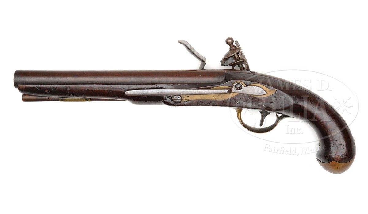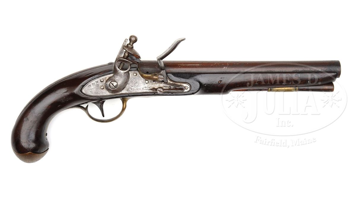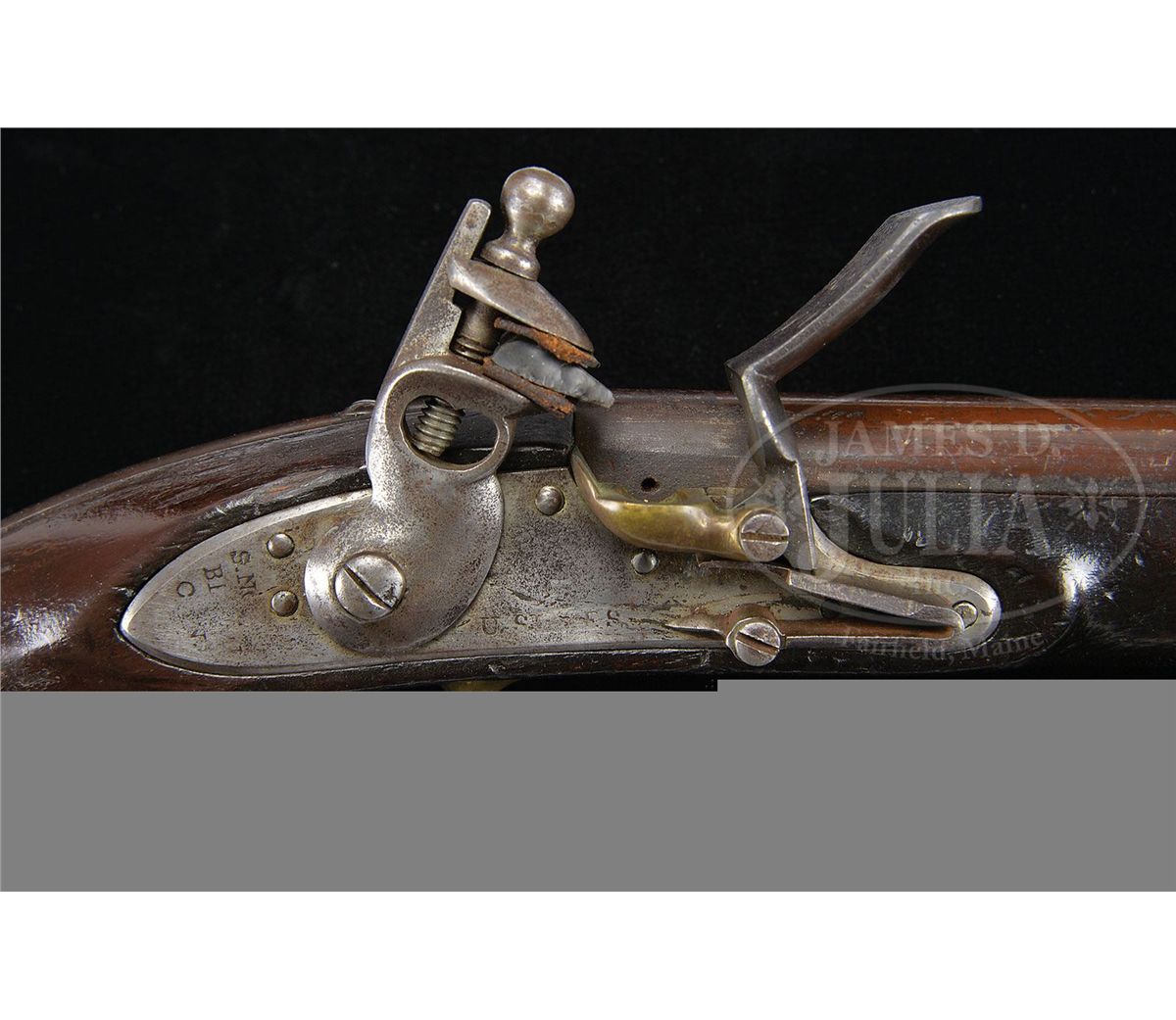 NSN. Cal. 68. x 10" rnd unmarked iron bbl and is reconverted back to flint. Lock marked with "U.STATES." partially legible, reading vertically in three lines behind the cock. "S. NORTH/BERLIN/CON." partially legible. Inside of lock is marked with a "B" on the lock plate, "t" on the pan screw, on the main spring screw, both bridle screws, the sear, the sear spring screw but not on externally on the cock screw and battery screw confirming this gun is a reconversion. Battery spring and screw are replaced. Walnut stock is unmarked having very nice edges. Opposite the lock is 6-3/4" long belt hook. Ramrod is 8-1/2" and old however not orig to this gun. PROVENANCE: See Guide to American Antique Firearms and Their Values, 1998, by Flayderman, pp. #6A-009. Collection of Dr. Douglas Sirkin. CONDITION: All the ironwork is in very good condition only having light pitting around touch hole area and face of cock. All brass furniture has nice patina. Stock is in very good condition with minor handling nicks and dings. Difficult to find today as only 2,000 were delivered. 4-49782 PAS54