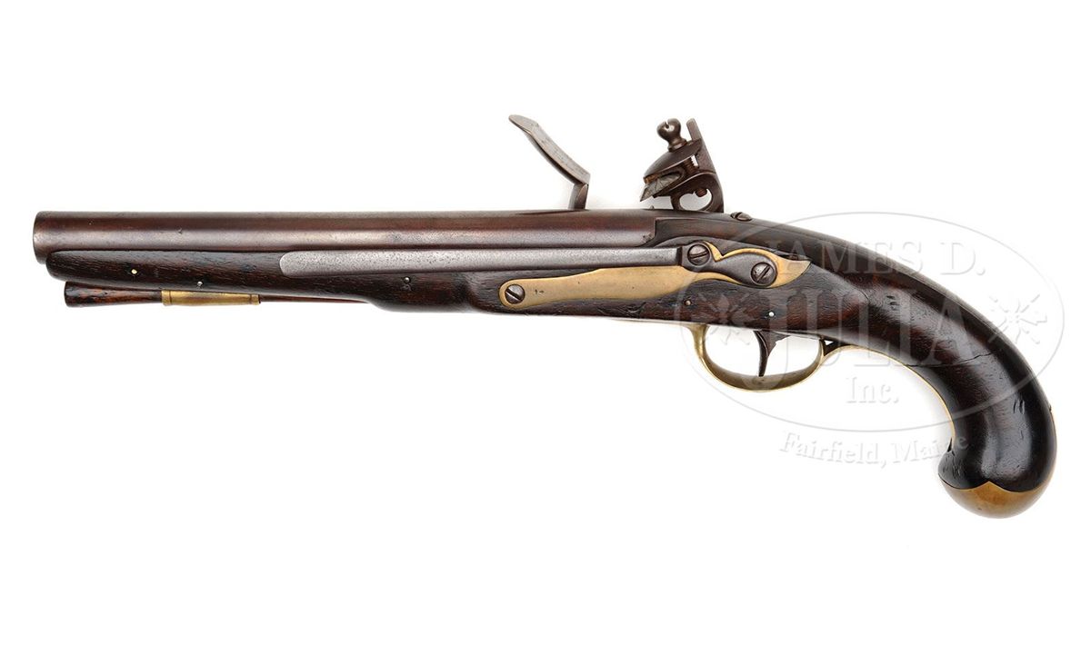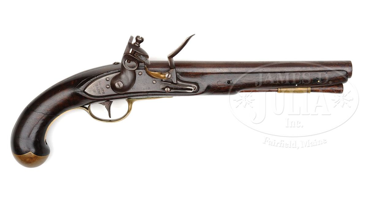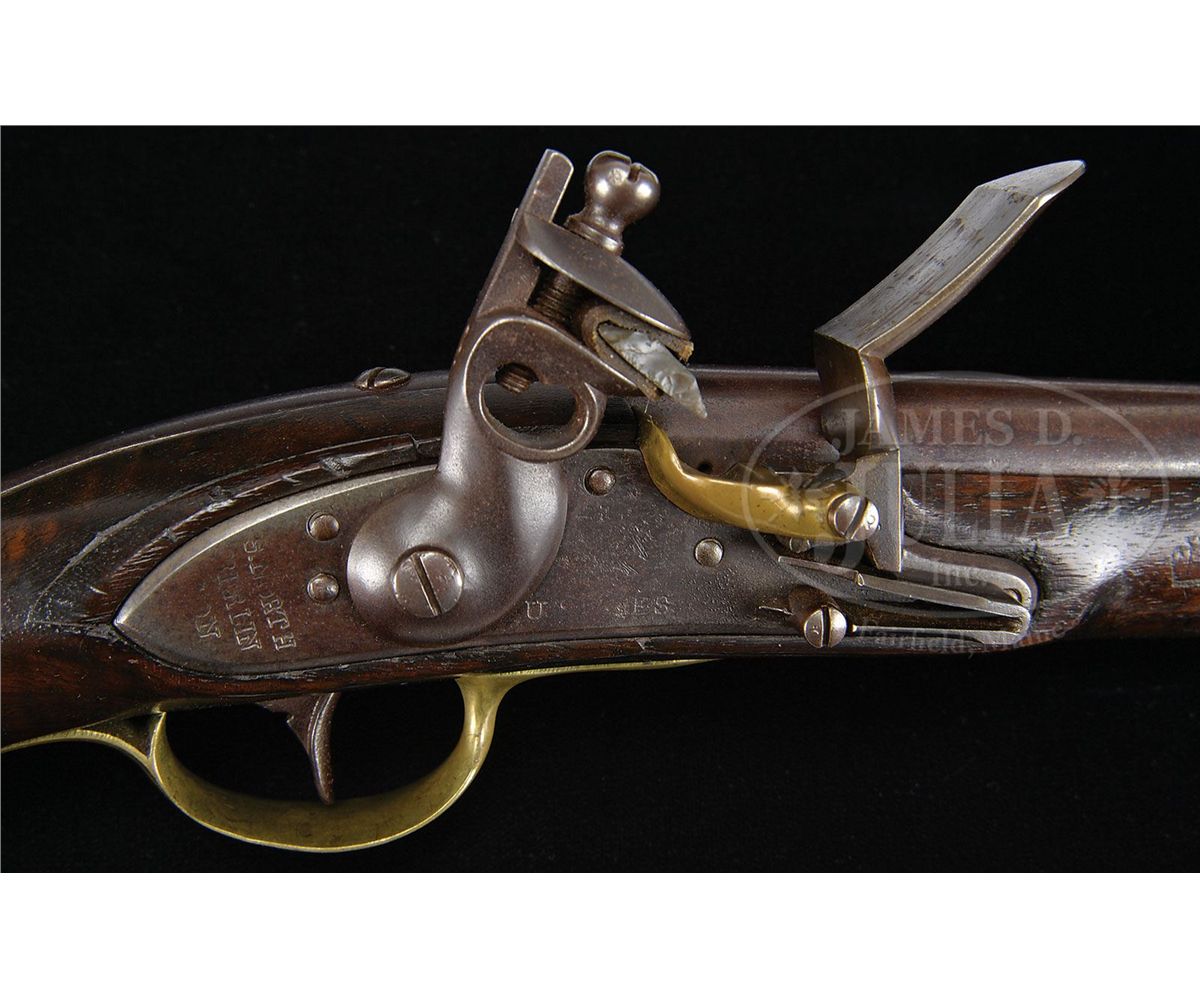NSN. Cal. 68. x 10" rnd unmarked iron bbl and is reconverted back to flint. Lock marked with "U.STATES." partially legible, reading vertically in three lines behind the cock. "S. NORTH/BERLIN/CON.". Inside of lock is marked with a "D" on the lock plate, "7" on the pan screw, on the main spring screw, both bridle screws, the sear spring screw but not externally on the cock screw and battery screw (4) confirming this gun is a reconversion (cock, frizzen and frizzen spring appear to be orig parts used in this reconversion). Walnut stock is unmarked having very nice edges. Opposite the lock is 8" long belt hook. Ramrod is 9-1/2" and old however not orig to this gun. PROVENANCE: Collection of Dr. Douglas Sirkin. CONDITION: All the ironwork is in very good to excellent condition only having very light pitting on bbl and lock. All brass furniture has nice patina. Stock is in very good condition having a 2-1/4" long x 3/16" piece of wood replaced over the back of the lock. Handle was completely cracked through 2" above buttcap, but has been solidly repaired, 3" long stress fracture running through the ramrod pipe pin and bbl pin not affecting overall soundness, balance of stock refinished. Difficult to find today as only 2,000 were delivered. 4-50070 PAS55
