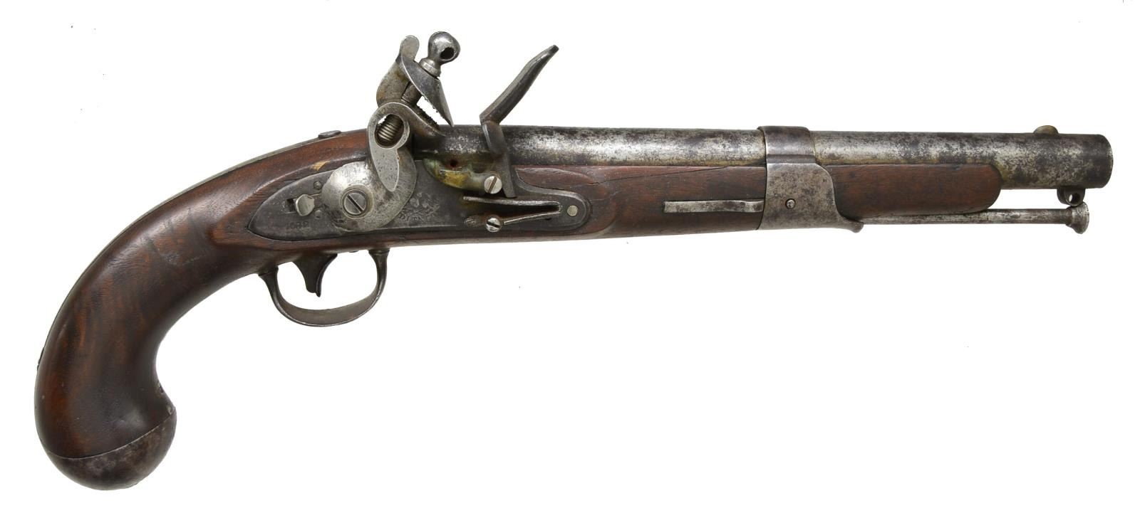 Cal. 54. NSN. Bbl. 10" rnd. w/ smooth bore & brass blade front sight. 1822 Dated lock. Band fastened walnut stock w/ iron fittings. Replacement button tipped ramrod missing swivel apparatus. CONDITION: cleaned gray metal shows areas of surface corrosion & pitting becoming heaviest in breech area. Stock has an added wood repair above forward portion of lock w/ cracks in sideplate areas. Lock is missing mainspring tension. Dark pitted bore. (01-18815/DS). ANTIQUE. $600-900.