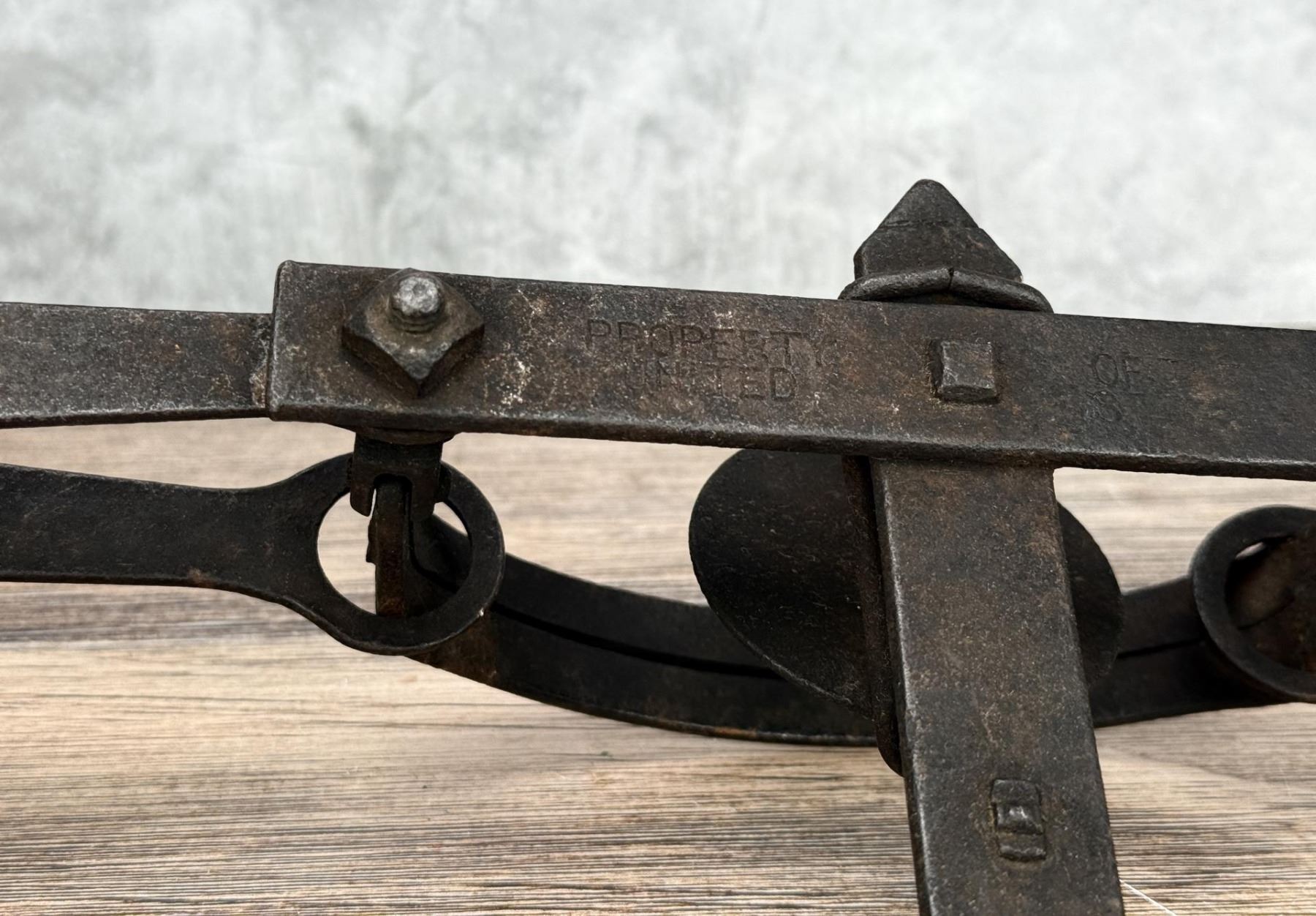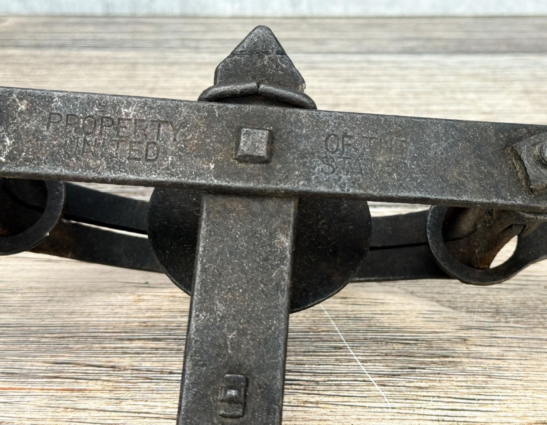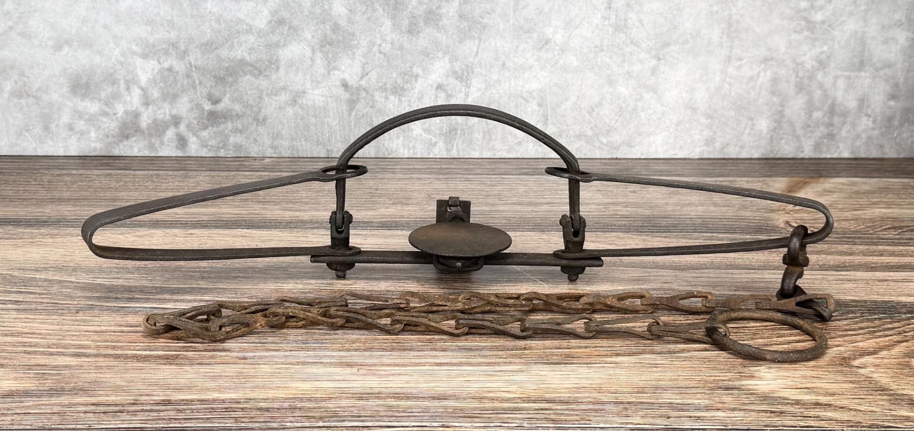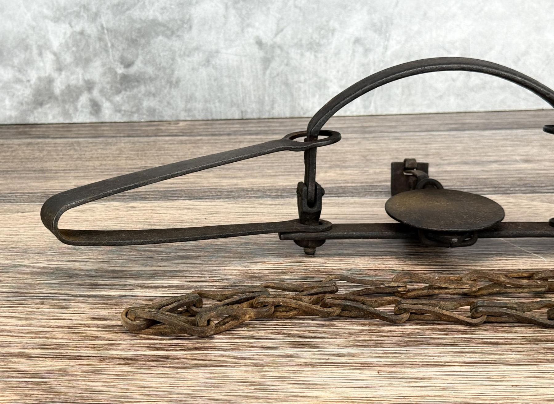 Very nice hard to find trap. Property of US Marked on base and on jaws. Chain attachment is broken.