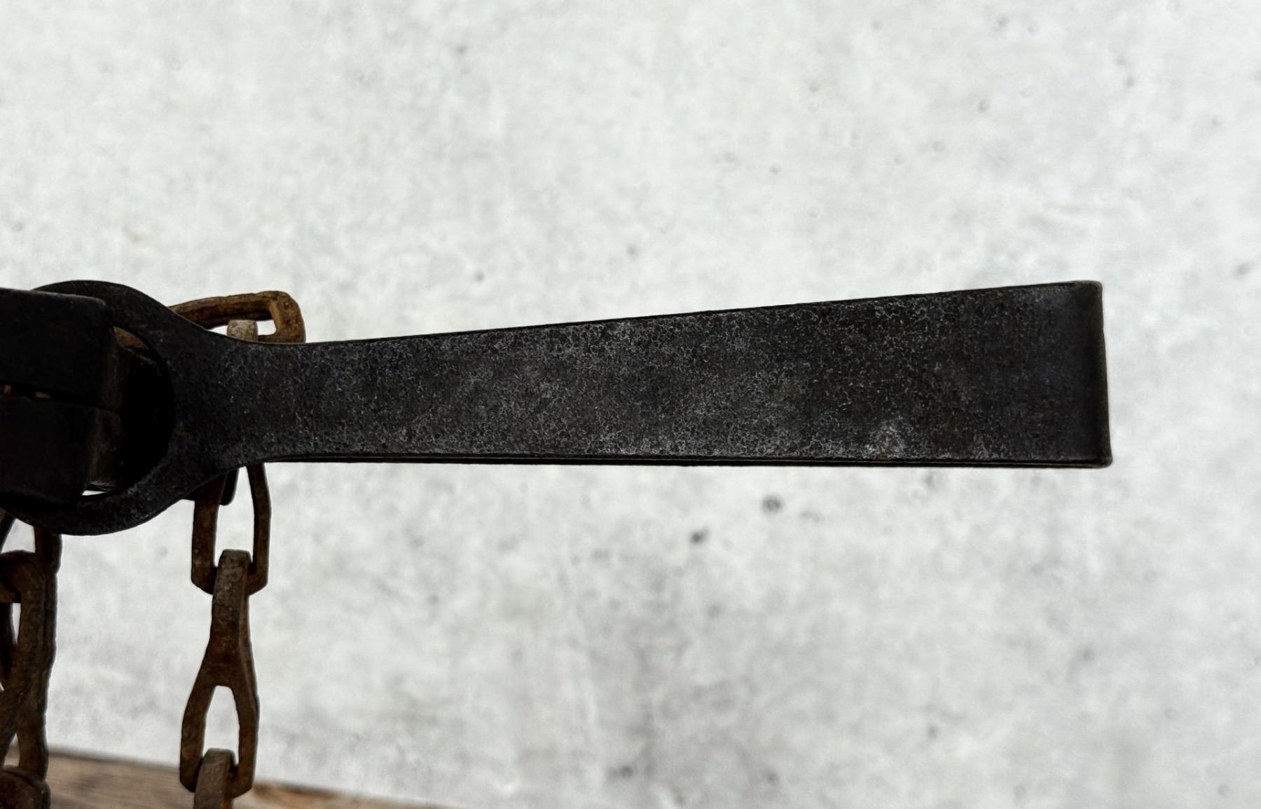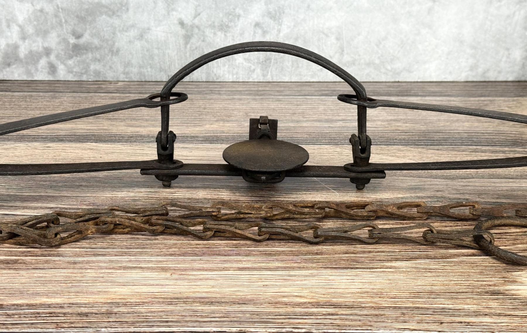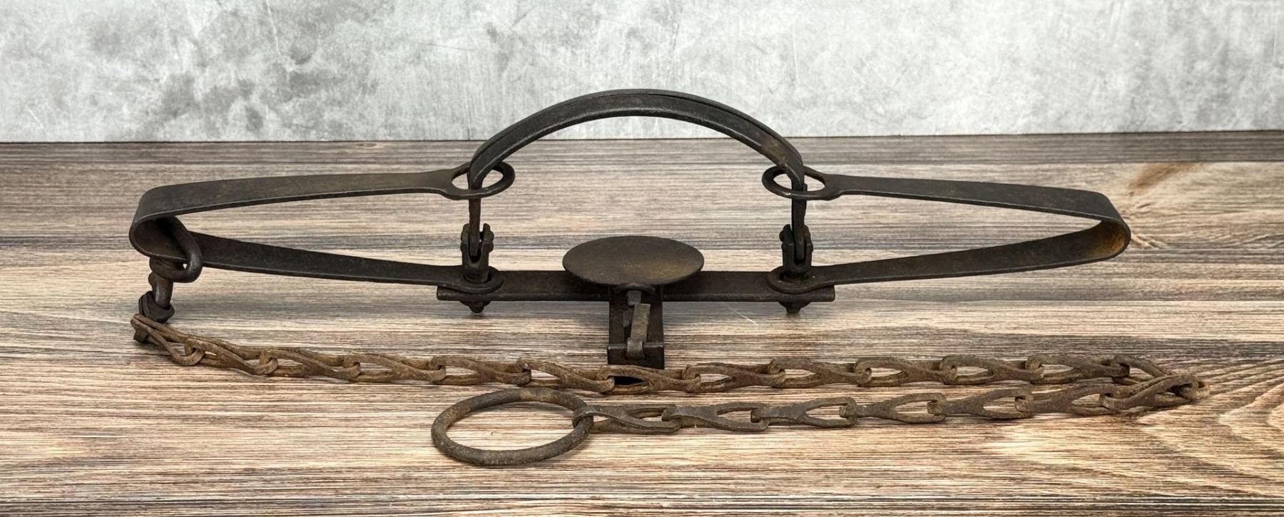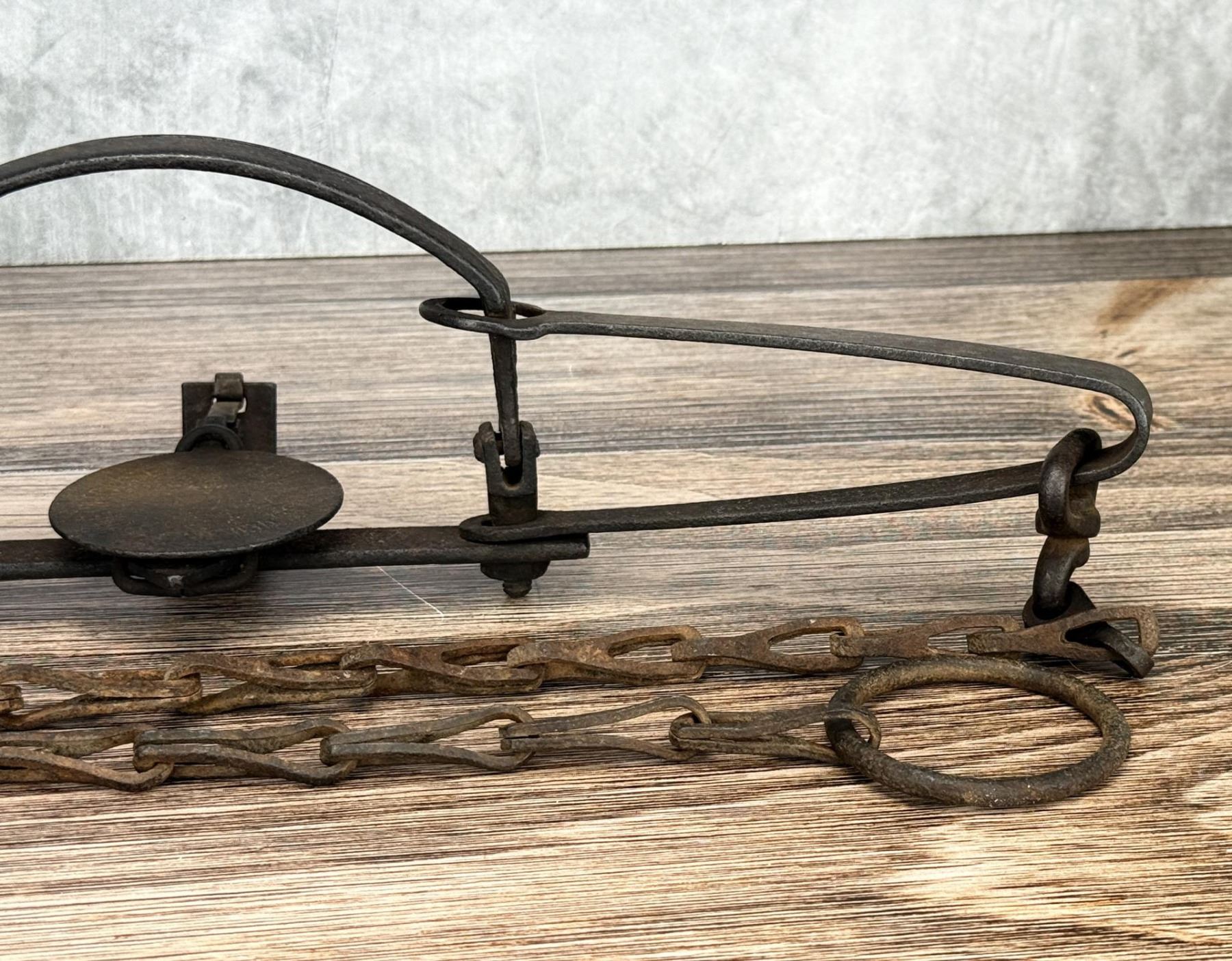 Very nice hard to find trap. Property of US Marked on base and on jaws. Chain attachment is broken.
