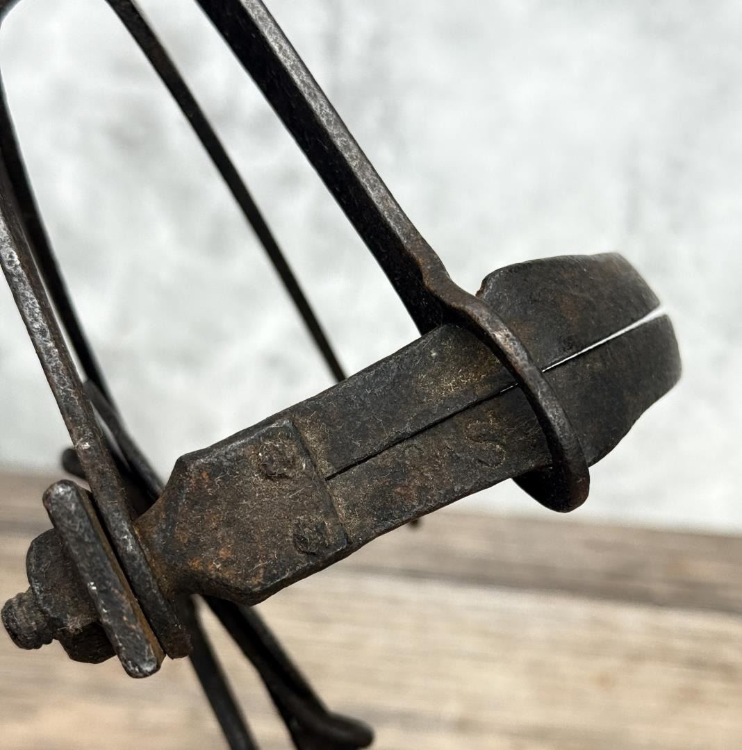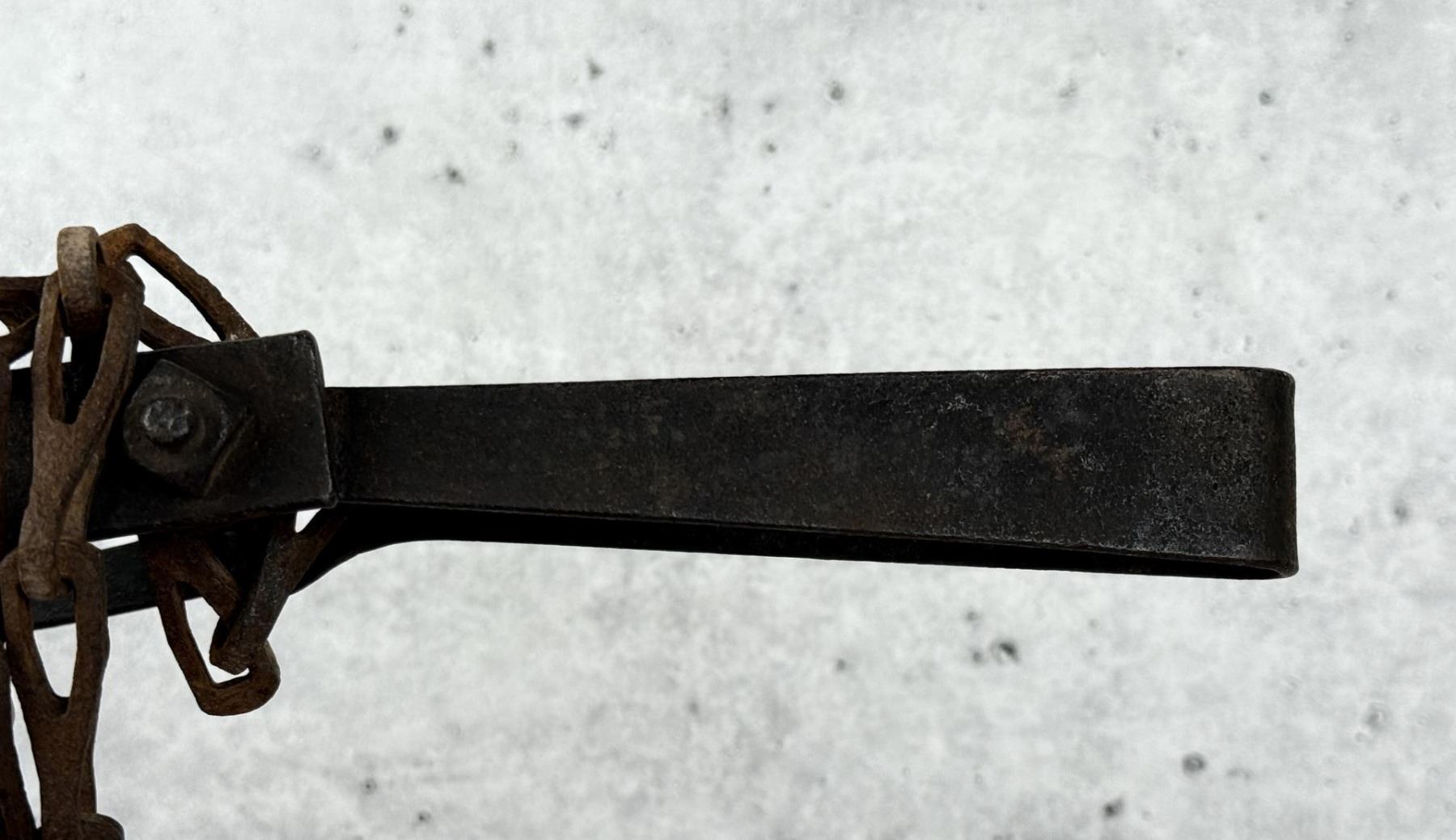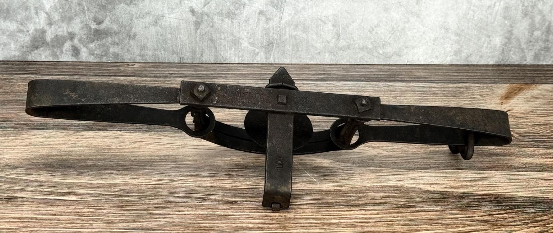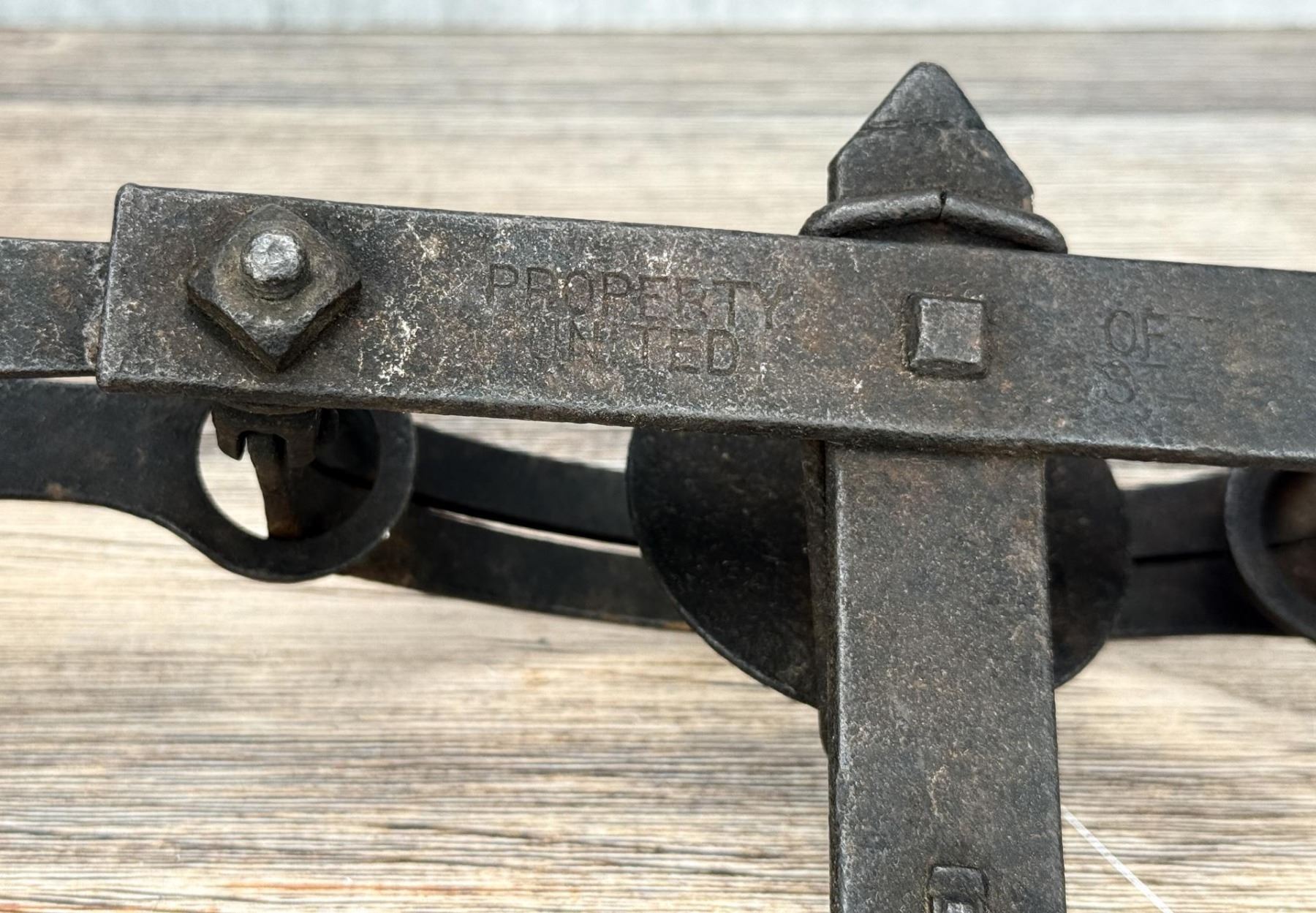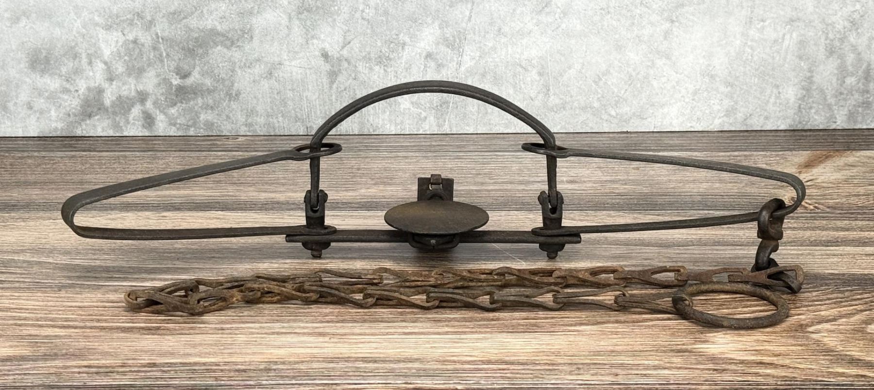 Very nice hard to find trap. Property of US Marked on base and on jaws. Chain attachment is broken.