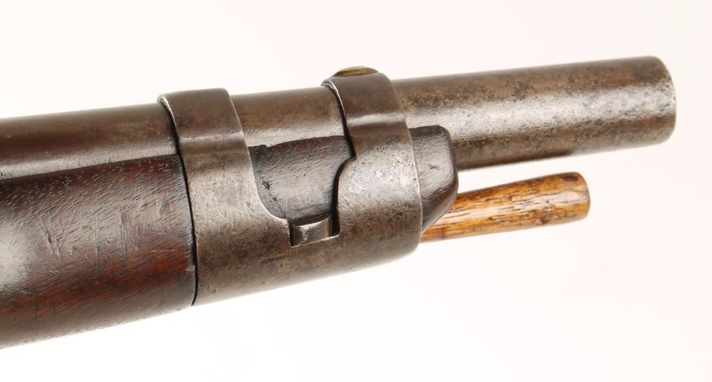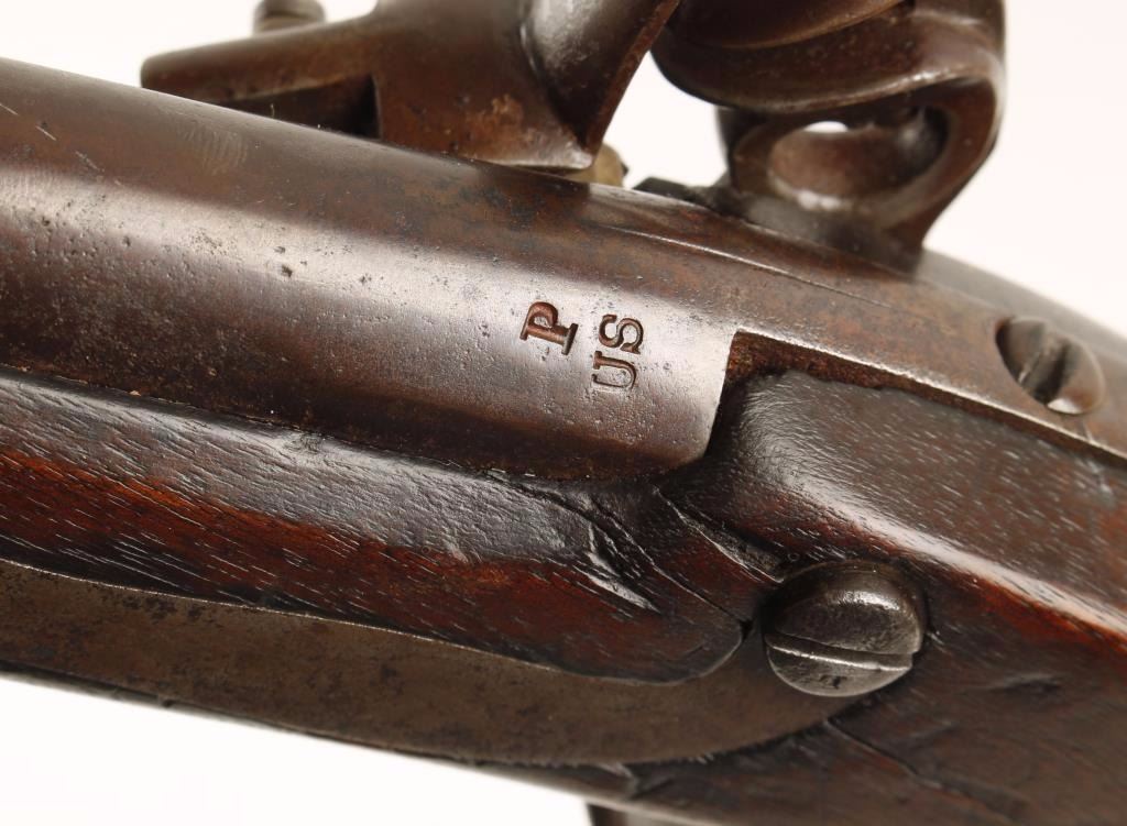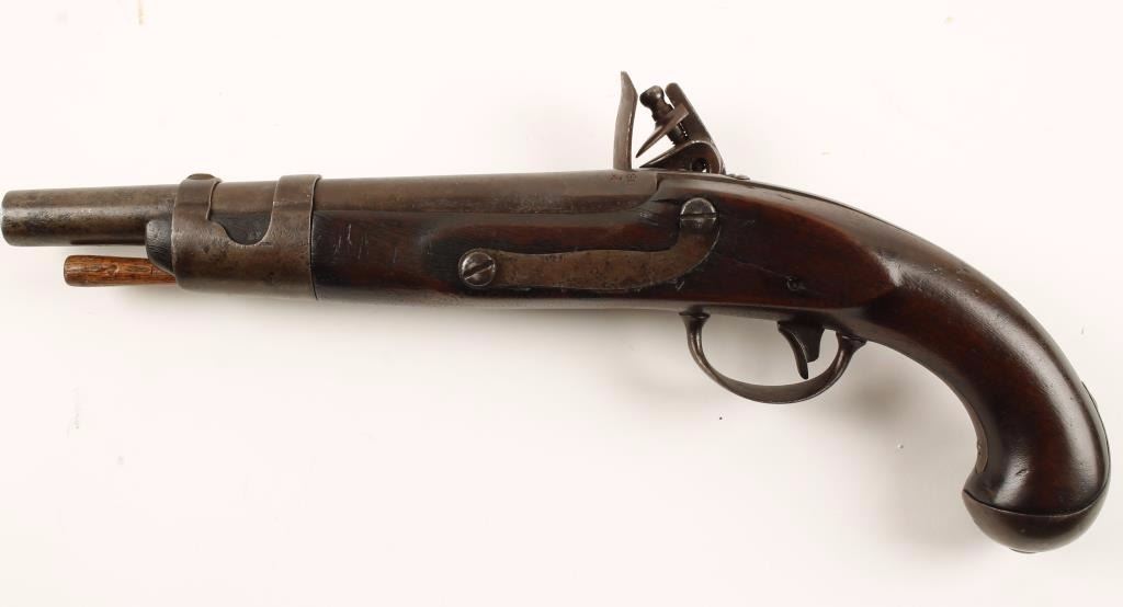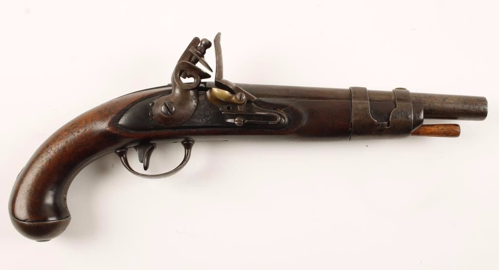 Early production U.S. Military model 1816 flintlock pistol chambered in .54 caliber, circa 1817 - 1820. These pistols were used in the Seminole Wars, Mexican War and converted to percussion for use in the Civil War. Features a 9 1/16" barrel proofed "P" & "U.S.", lock marked "S. North/U(eagle)S/Midln Con.", brass blade sight on barrel band, notched rear sight, brass flashpan, original flintlock configuration, hickory ramrod without ferrule, iron furniture and a one piece hardwood plain pistol grip stock. Pistol shows an even dark patina with mostly legible markings. Wood stock is very good with a faint remnant of original cartouche, dings, some cracks and small losses. Bore is clear and action is in working order. A great piece of early U.S. Militaria. Condition is very good as antique. ***Antique Firearm***