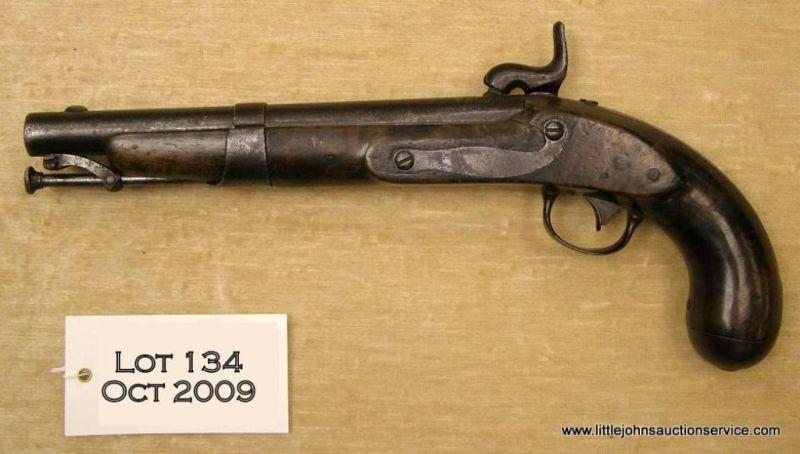 S. North U.S. military single shot pistol, converted to “in barrel” percussion from flintlock, .54 cal., 8-1/2” barrel, dark brown patina to metal surfaces, sharp markings, lock dated 1827, good action, good wood with old crackon right side of stock in front of the lock plate and two small round wood repairs to the left side of the stock above the trigger (possibly where a belt hook had been attached). Ram rod retained. Est.: $900-$1,800.