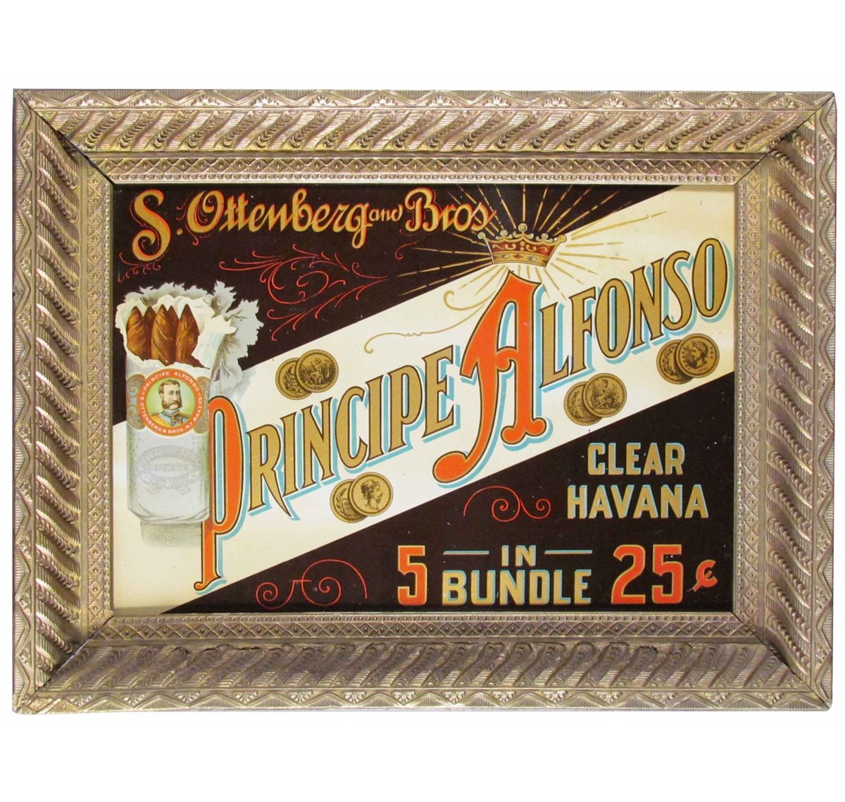 S. Ottenberg and Bros. Principe Alfonso Tin Cigar Sign. A few slight surface scratches otherwise excellent condition. 13 1/2 X 9 1/2 inches.