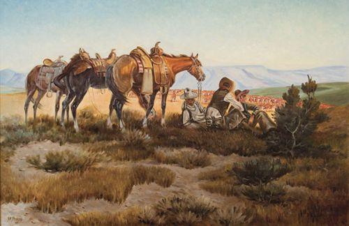 S.P. Stevens. (Deceased) (Texas). "Noon Break". 24" x 36". Oil on Board. (est $1,500-2,000).
