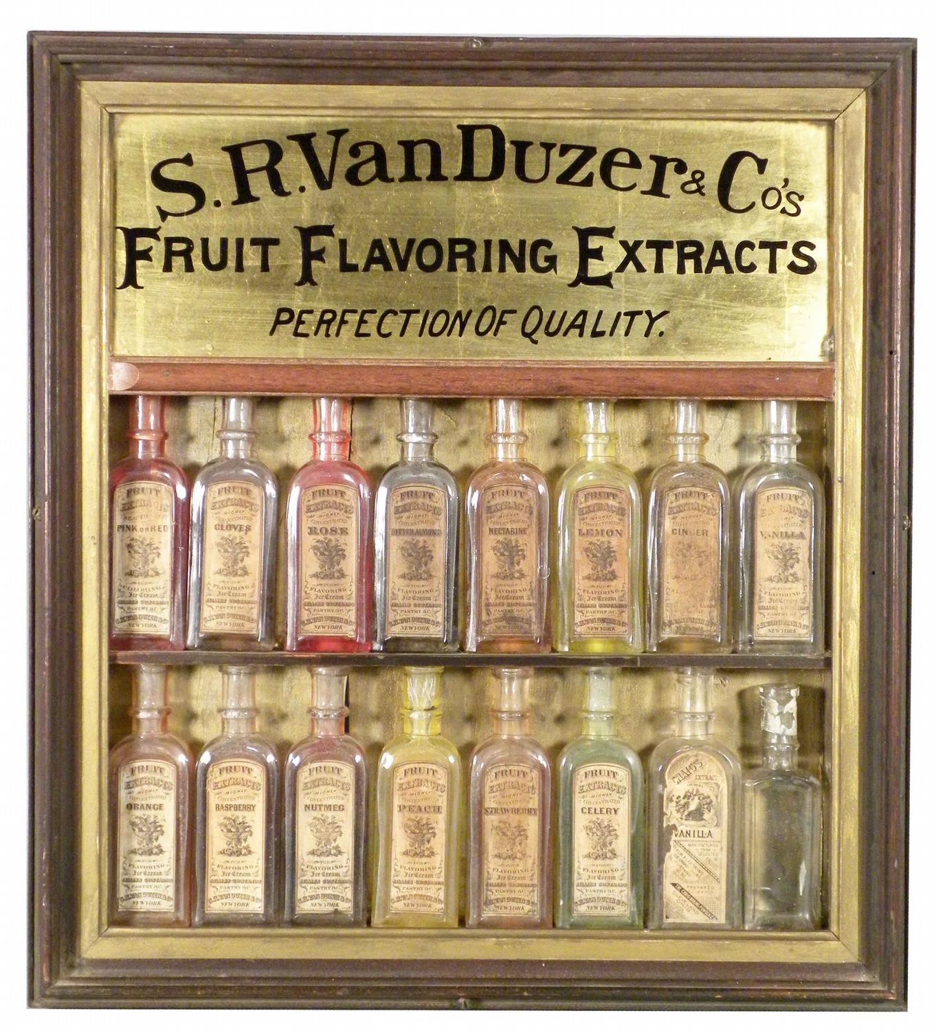 S.R. Van Duser & Co's Fruit Flavoring Extracts. Reverse Glass Cabinet with product bottles. Outside glass missing and one bottle without label otherwise excellent condition. 18 X 19 1/2 X 2 1/2 inches.