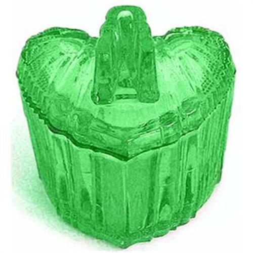 Produced by S. Reich & Co., circa 1920s, this lovely glowing green Elegant pressed Depression Glass heart shaped vanity or dresser jar features an intricate Art Deco geometric design that flows elegantly through its curves. Measuring 4" x 3 1/2" and in excellent condition. We have one more of the smaller matching jars, the larger matching jar and the matching tray from this set in other auctions