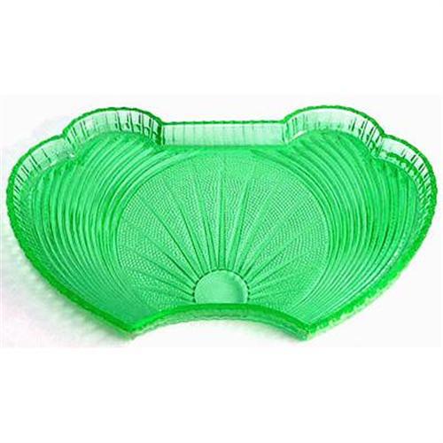 Produced in Czechoslovakia by S. Reich circa 1930s this lovely glowing green Elegant Depression Glass vanity or dresser tray features a sculpted curvacious rim and an intricate Art Deco sunburst geometric design that flows elegantly through its curves. Measuring 14" x 9" tray and in excellent condition. We also have the two smaller matching dresser jars and the larger matching jar from this set, for sale separately and in other auctions