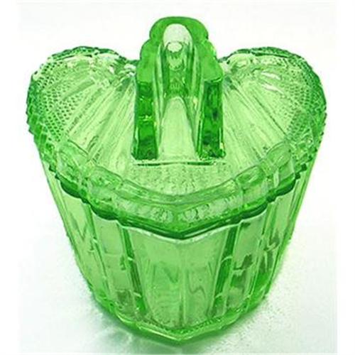 Produced by S. Reich & Co., circa 1920s, this lovely glowing green Elegant pressed Depression Glass heart shaped vanity or dresser jar features an intricate Art Deco geometric design that flows elegantly through its curves. Measuring 4 x 3 1/2 inches and in excellent condition. We have the larger matching jar and the matching tray from this set in other auctions