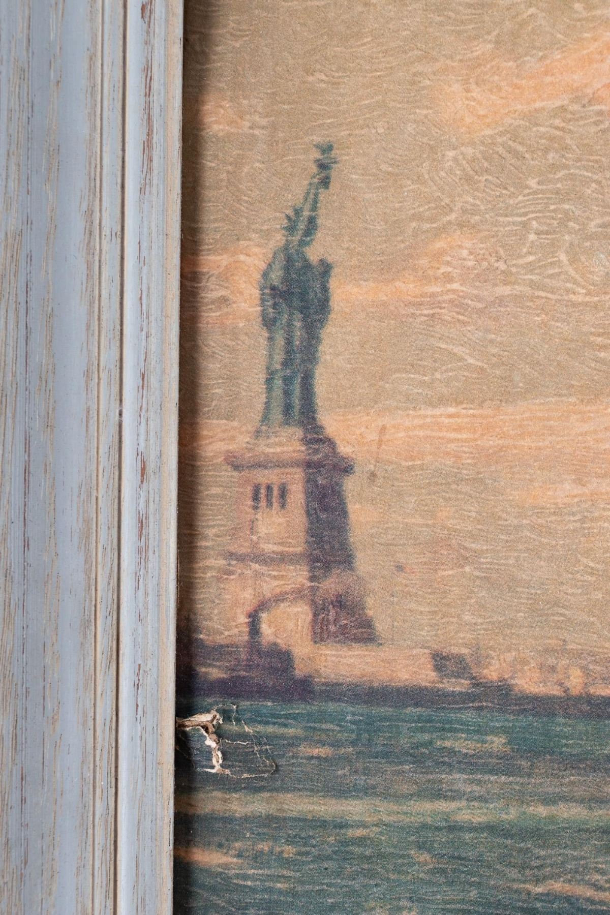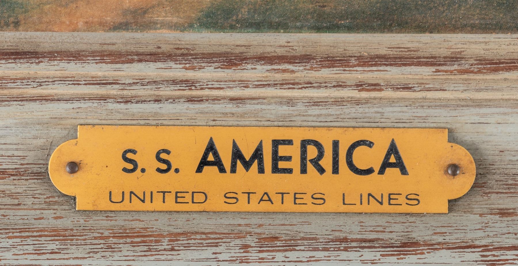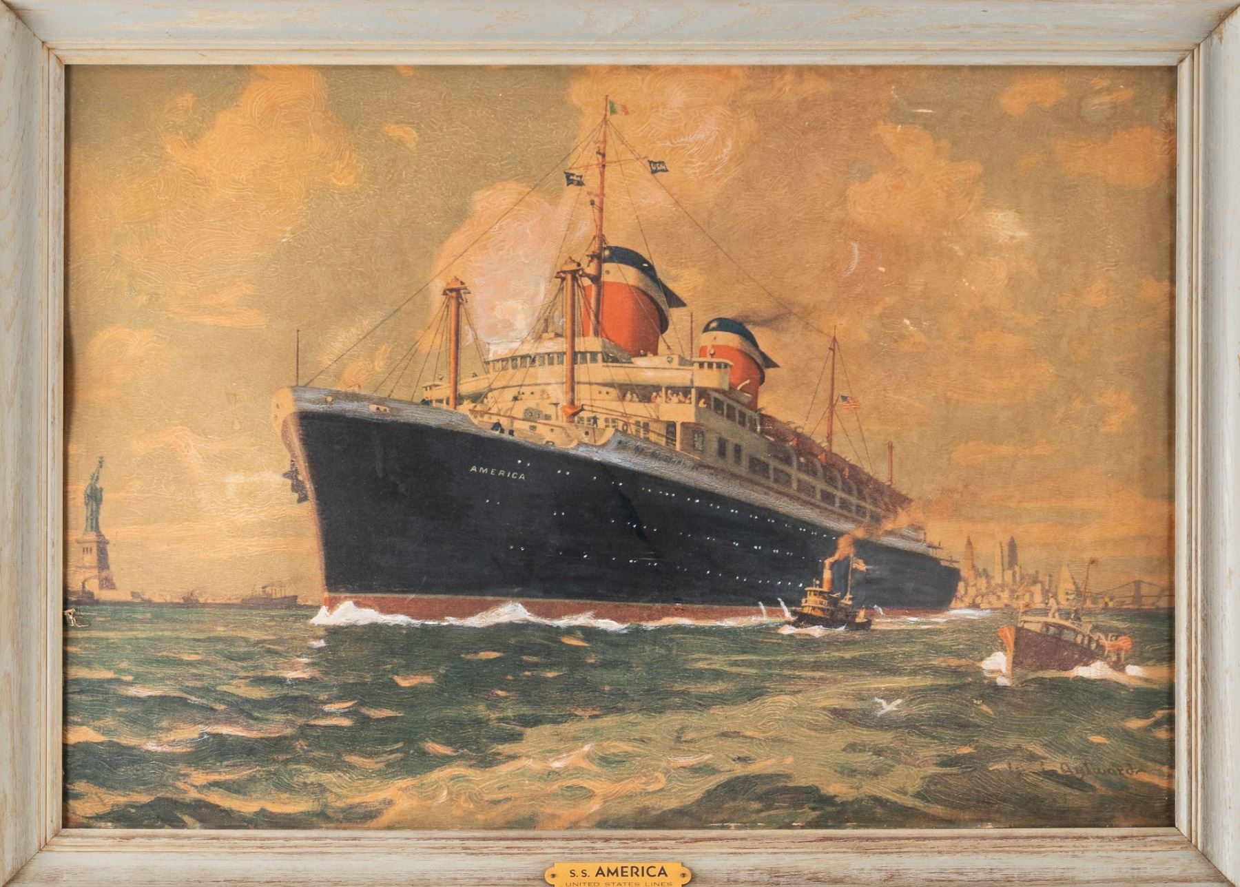 Print of the S.S. America made by artist Agelwarda. Hand-finished print overpainted by the artist to create a special texture. The print shows the ship leaving the port of New York with several other smaller ships. The ship is shown flying three flags, one with an American eagle symbol, a 'USA' flag, and an Italian flag. Visible area 19.5 x 28.5 inches, slight bowing of print. Small hole at the left margin, minute abrasions. Mounted in a simple green painted wood frame 23.75 x 325 inches.