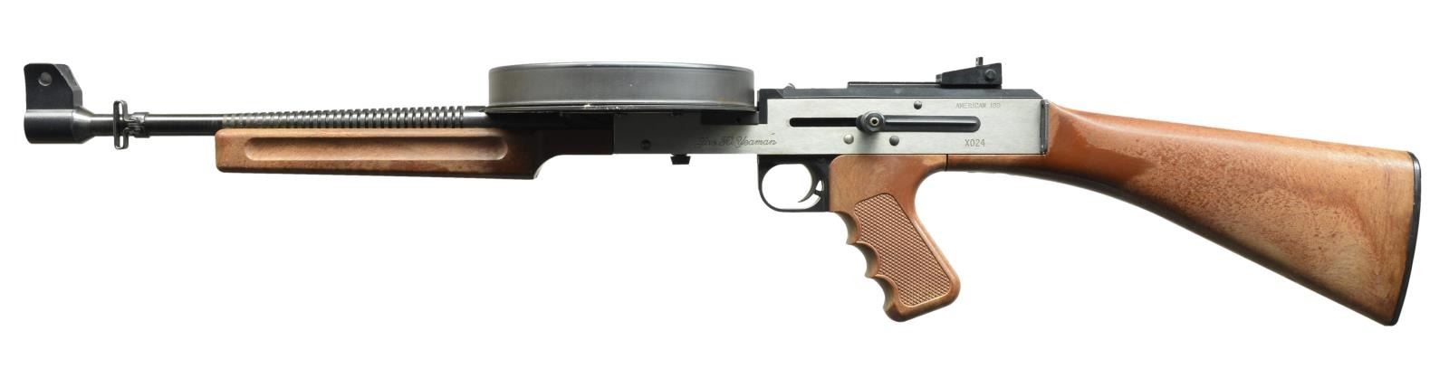 Cal. 22 LR. S# X024. Bbl. 16.5". Originally mfg. & imported from Austria, the earliest American 180 variants were classified as Dealer Samples due to the inability to import transferable machine guns after 1968. E&L mfg. started building a version in the United States & since they were domestic in mfg., these were fully transferable firearms. Research has indicated that approx. 24 examples were mfg. & registered by S&S Arms. It’s interesting to note that this particular gun bears the S# X024, possibly being the last firearm produced. The American 180 is an open bolt, select fire 22 LR buzz saw that feeds from a 176 rd., 3 tiered drum. The cyclic rate is often rumored to be in excess of 2000 RPM & a single burst in a full mag. is completed in only 7 seconds. The sound is as unique as its appearance, compared more to that of a chainsaw than a firearm because of the excessive cyclic rate. The bbl. is finned in a similar style to that of the legendary Thompson w/ a protected blade front sight & an adj. peep rear sight. The forend, pistol grip & shoulder stock are a brown plastic designed to imitate wood aesthetics. Pistol grip is checkered w/ finger grooves. Finish on all exposed metal parts w/ the exception of the natural finished aluminum receiver, is blued or black paint. Left side non reciprocating charging handle. Safety is located on the right side of the receiver. The selector is a cross slide pin. When pushed from left to right, full auto is selected & will continue to fire as long as trigger is held to the rear. When the pin is pushed in from the right, it is an open bolt semi auto action. The unique drum, w/ winding assembly is mounted on the top, above the chamber, forward of the trigger. The ejection port is below the firearm forward of the trigger. Receiver marked on left side w/ name of previous owner tastefully engraved just above ejection port. Right rear markings are "AMERICAN 180" over "X024". Right side receiver markings include "S&S" logo & "S&S ARMS CO."/ "ALBUQUERQUE, NM"/ "U.S.A.". Bbl. marked on top w/ 2 indistinguishable marks, "73" & "AMERICAN INTERNATIONAL CORP"/ "SLC. UTAH USA"/ "A001881". Top of bbl. just rear of front sight marked "MADE IN AUSTRIA". Removable rear stock locks w/ a single pushbutton to the rear of the receiver similar to that of a Thompson SMG. Sling swivels front & rear on left side. MAGS: 2-176 rd. drums w/ 1 winder. UNATTACHED ACCESSORIES: 1 early Aimpoint original red dot sight. Function can’t be confirmed as an old battery appears to be lodged in the carriage. 1 Weaver 63B mount. Original Styrofoam packaging. CONDITION: original finish enjoys full coverage on exposed metal surfaces. No major visible flaws of any type. The only evidence of any use is a minute amount of powder fouling in the feed area. Plastic furniture exhibits only light handling marks, however the rear portion of the shoulder stock leans more towards a matte finish. Fire control mechanism appears to function correctly when cycled by hand, though a proper modern cleaning may be in order. Both drums appear to have seen little use & both rotate freely. NATIONAL FIREARMS ACT SMG REQUIRING BATF TRANSFER BEFORE TAKING POSSESSION. FULLY TRANSFERABLE. (03-1486/JZ). MODERN CLASS III. $6,000-9,000.