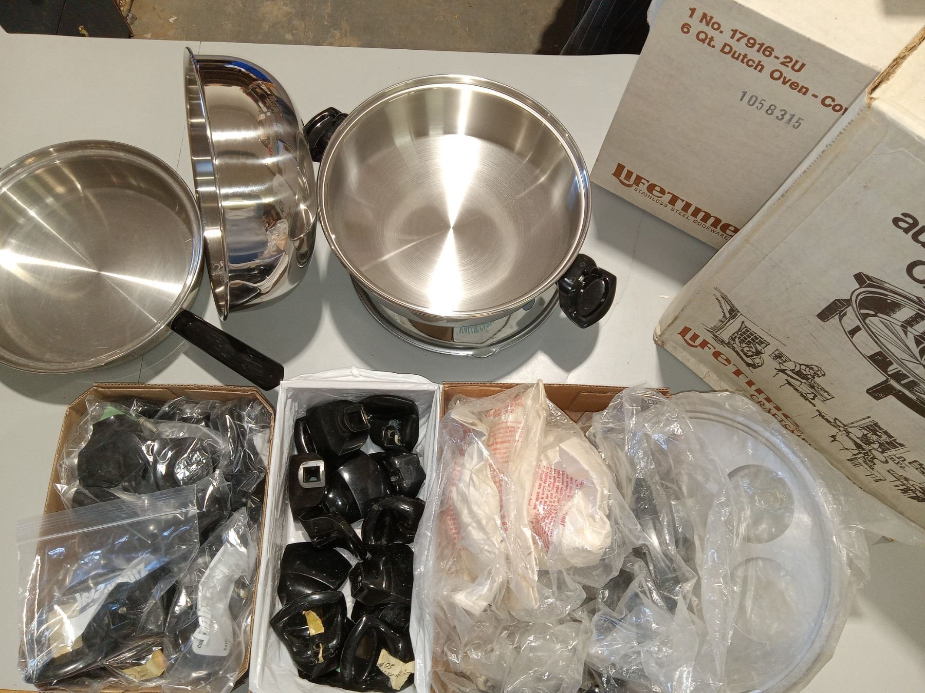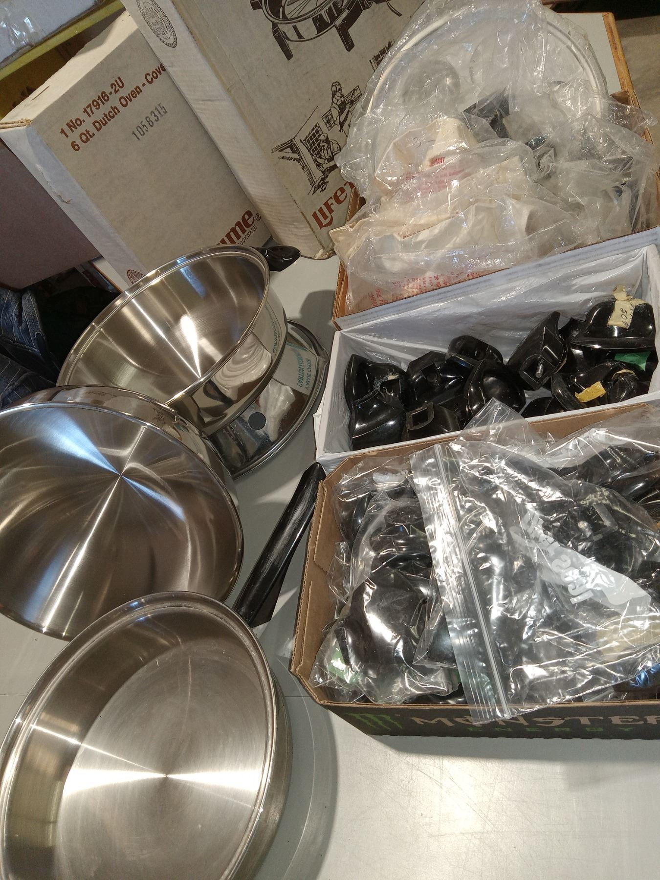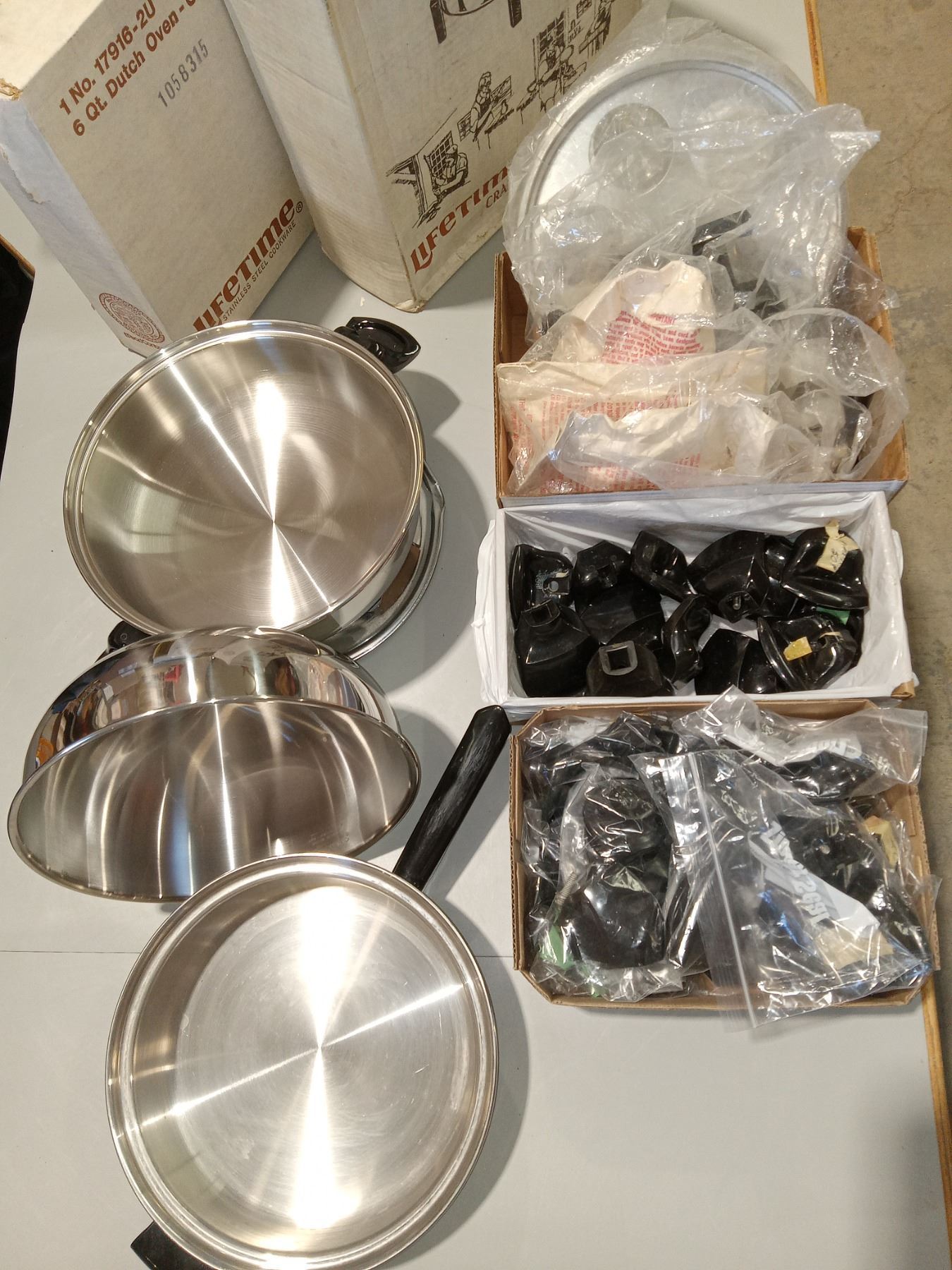 S.S. ELECTRIC CASSEROLE w/ DOME LID (x2); WOK BOWL, PAN; c/w SPARE CORDS, LID & POT HANDLES.