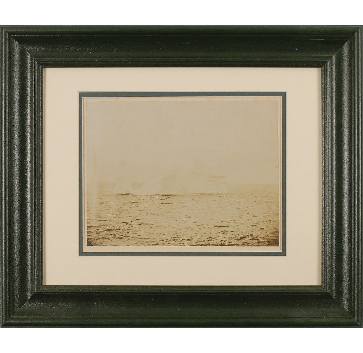 A vintage semi-glossy 9.25 x 7 photo of an iceberg, taken by a crew member of the cable ship S.S. Minia, the second ship chartered by the White Star Line to recover bodies of Titanic victims. This undated photo probably pre-dates the Titanic disaster. Double matted and framed to an overall size of 17.5 x 14.5. Some fading to upper portion of image and light silvering along bottom edge, otherwise fine condition.