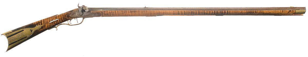 Brass blade front with fixed rear sights. Barrel marked "S. Smith" Double set triggers and a brass patch box. Chunk of wood missing above the lock.