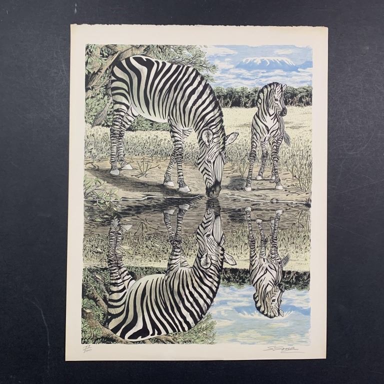 S. Sona's "Zebras" limited edition print, signed lower right and numbered 149/300 lower left. This piece is of a mother and baby zebra, drinking from a small pond, with their reflections at the bottom on the print. This piece is in near excellent condition with a miniscule incision at bottom, and some very light discolouration at left edge and upper right corner
