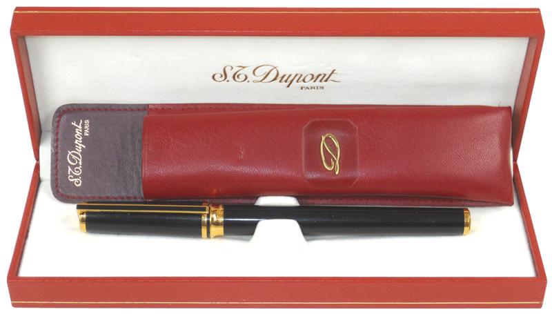 S.T. Dupont fountain pen in case, made in Paris, black lacquer, marked 5aDLT35 & "S.T. Dupont Paris laque de Chine", comes w/red leather pocket case w/emblem, Exc new-old-stock cond, pen is 5.25"L.