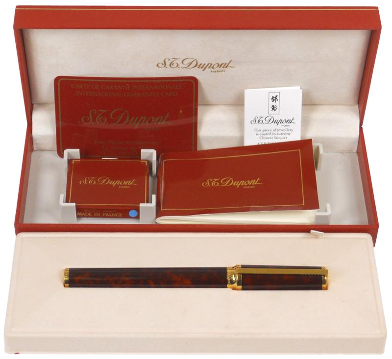 S.T. Dupont fountain pen, made in Paris, mottled brown lacquer pen in case w/7 refills, certificate 19073 & guarantee card, marked "Made in France" & "S.T. Dupont Paris laque de Chine", Exc cond, 5.5"L.