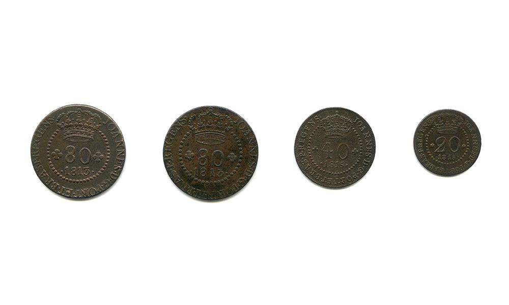 80 Réis 1813 R 41 pérolas (03.04; AI C464) MBC+, 1813 R 38 pérolas (03.03; AI C464) lindo MBC; 40 Réis 1815 R 44 pérolas (02.02; AI C463) BC+; 20 Réis 1815 R 36 pérolas (01.02; AI C461) MBC