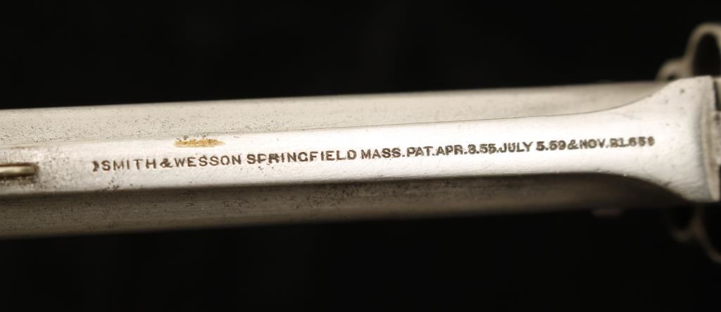 Nickeled single-action spur-triggered 5-shot tip-up revolver with a 3-1/2" barrel with top rib. The plating is almost all gone, possibly removed, with only the cylinder stop retaining any. Exposed steel has small areas of light pitting with some deeper pits in protected areas. Cylinder stop is loose and doesn't stop the rotation of the cylinder. Hammer and trigger work well. Bore is dark with rust. Cylinders are frosty and with pits. Rosewood grips have worn down a bit and have scratches. Condition is poor. *Antique Firearm*
