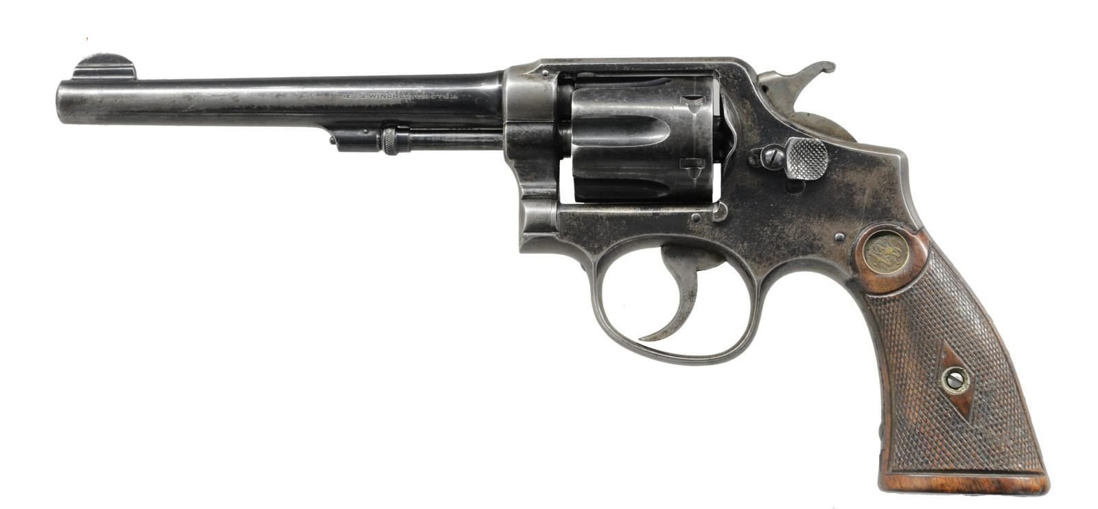 Cal. 32-20. S# 55169. Mfg. 1909-15. Bbl. 6" pinned. 5-screw square butt frame. Smooth trigger. CONDITION: original finish is largely faded on frame & barrel. Muted case coloring faintly visible on trigger & hammer. Checkered diamond Smith & Wesson grips show some wear and numerous light scattered handling marks with some added varnish. Grips are fastened to the frame with epoxy or glue. CURIO. (23-1883/BF). $200-300.