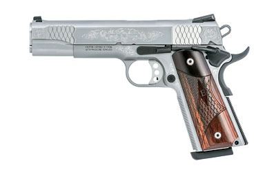 Smith & Wesson, 1911, Semi-automatic, Full Size, Single Action, 45 ACP, 5" Barrel, Stainless Steel Frame & Slide, Glass Bead Finish, Wood Grips, 8Rd, 2 Mags, Engraved, Thumb Safety, Fixed Sights