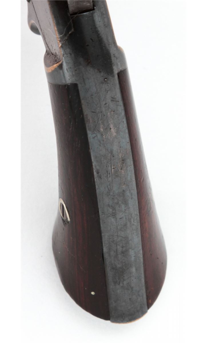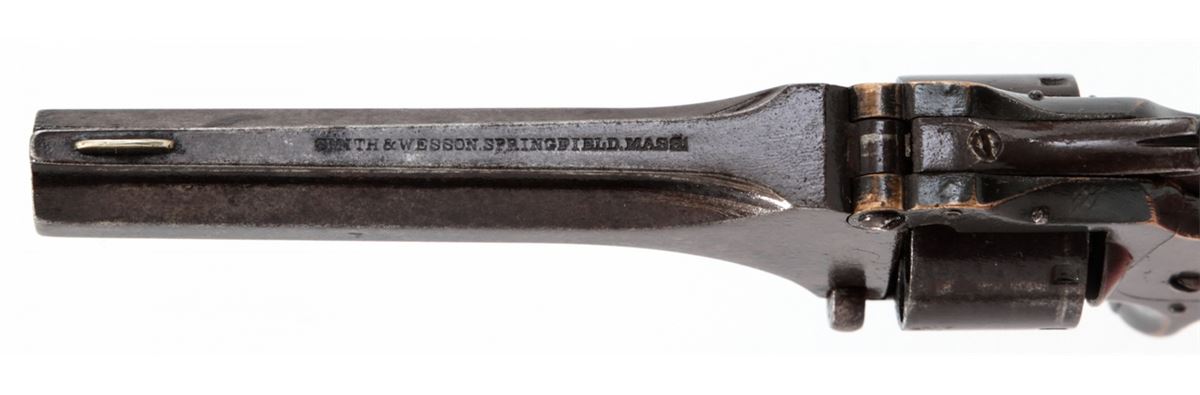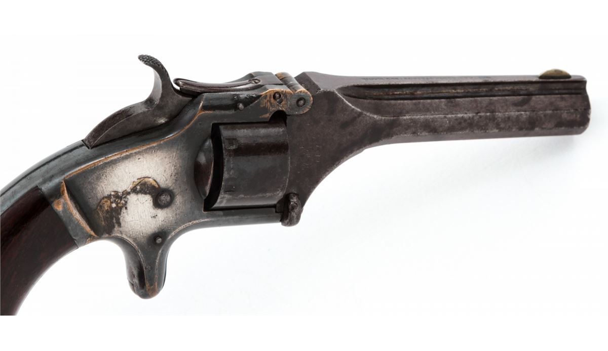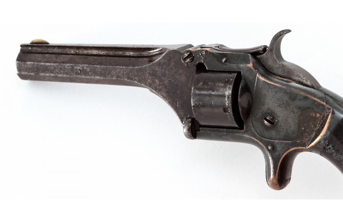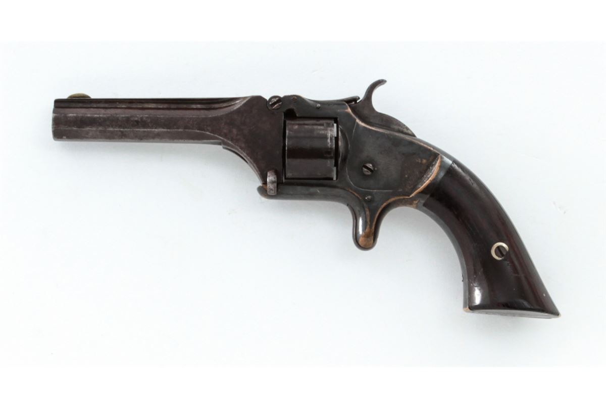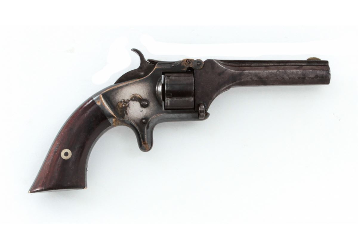 Smith & Wesson 1st Model 2nd Issue Revolver, #67481, .22 Short RF cal., 3-3/16'' blue barrel, silver-plated frame, rosewood grips. Mfg'd 1860-1868. Condition is good. Barrel assembly retains little original blue and has toned mostly brown, as has cylinder. Frame and sideplate with about 75% silver remaining. Rosewood grips with scratches and flattening to left panel near butt. Ejector rod is missing. Action is good, bore is fair. Est.: $250-$450. (Antique)