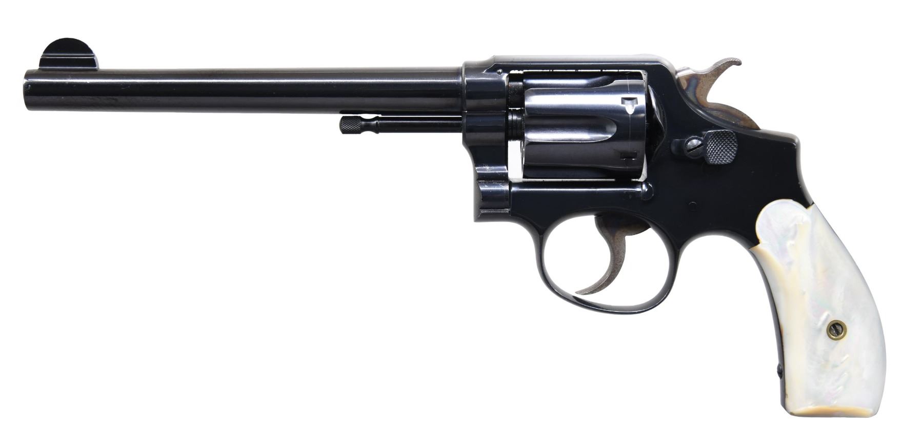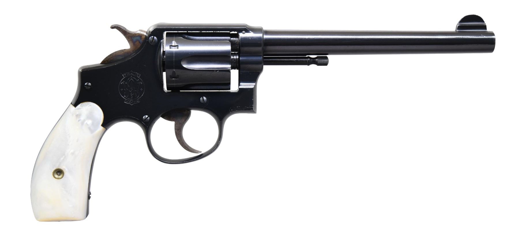 REVOLVER. Cal. 38 Spl. S# 79. Bbl. 6 1/2" pinned having company markings on top; no markings on sides. Integral 1/2 moon front sight blade; U notched rear sight. Mfg. 1899 (1899-1902) with round butt K frame; Civilian model as Army-Navy models had 6" barrels plus additional military markings. Matching numbers on barrel, frame and cylinder; unmarked extractor. Real pearl Service style grips; no medallions. Case colored smooth faced trigger and hammer with finely checkered spur. Often referred to as "pre 5 screw" with 4 screw side plate and no locking lug on barrel. CONDITION: fair to good non-factory refinish with light scratches mainly on barrel plus slight cylinder turn line. Very good case colors. Near excellent bore and grips. Fine mechanics and timing. PROVENANCE: From the Lifelong Collection of George Staden S&W Member #3451. (25-36/NW). CURIO. $450-600.