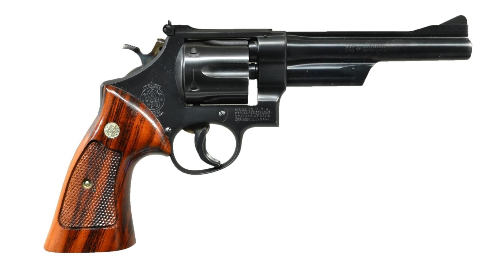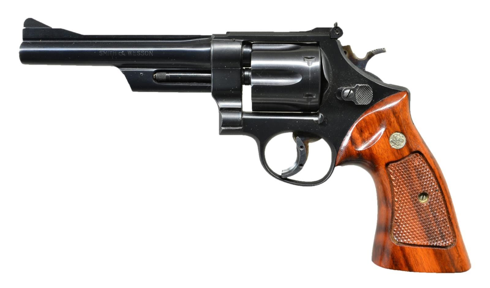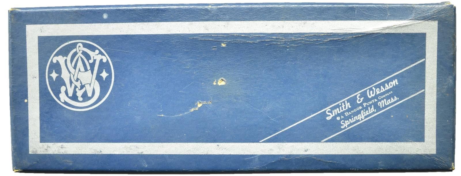 Cal. 357 Magnum S# S322340 Bbl. 6" Mfg.1968-1969 Model 28-2 Highway Patrolman. Fluted & counter-bored cylinder. Adjustable, micrometer click rear sight. Checkered hammer spur. Serrated trigger w/ serrated trigger shoe. Checkered walnut grips w/ S&W medallion. UNATTACHED ACCESSORIES: Numbered blue factory box w/ steel corners, cleaning kit & paperwork. Spare slim grips, checkered w/ S&W medallion. CONDITION: Blued finish coverage is complete and consistent with very little wear. Some gentle thinning around muzzle and a very light drag line on the cylinder. Timing seems tight and in sync. (22-2403/JZ). CURIO. $400-600