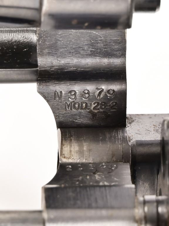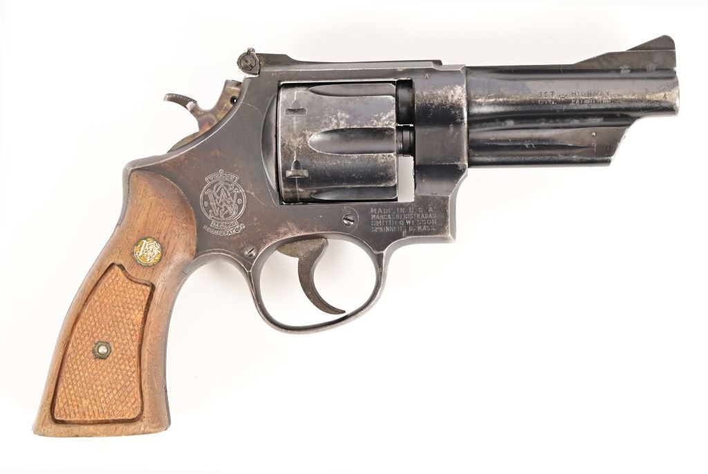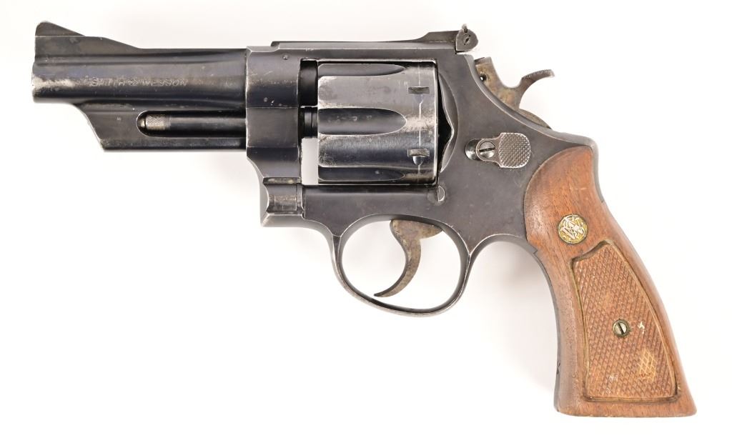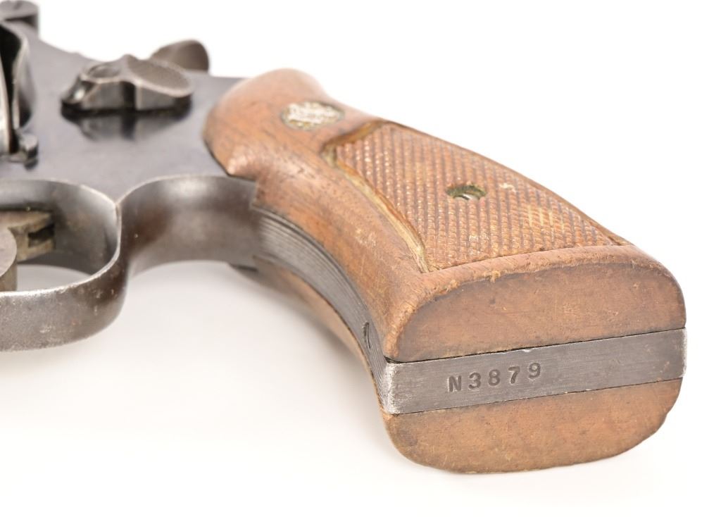 S/N N3879. Blued finish, 4" barrel, good bore, Good action, some wear on finish and grips. S&W checkered walnut grips. Modern