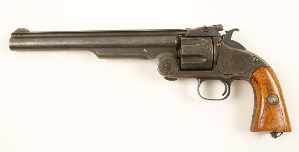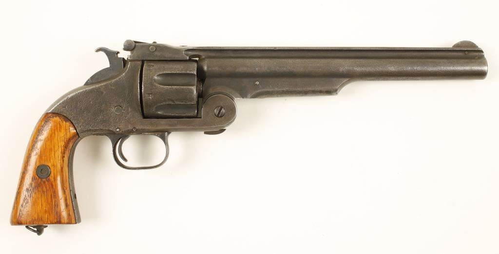 Blued single-action 6-shot revolver with an 8" barrel. Finish has faded/worn to a grey with extensive pitting throughout. The bore is pitted along the left side and near the muzzle. The chambers appear to be heavily pitted. The wood grips have scratches and dings. The action functions poorly. Condition is poor. *Antique Firearm*