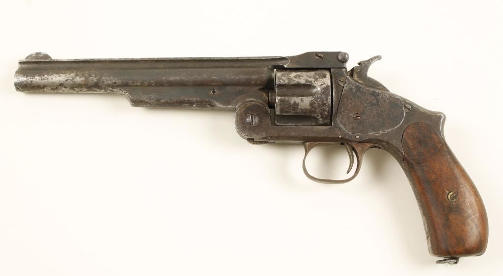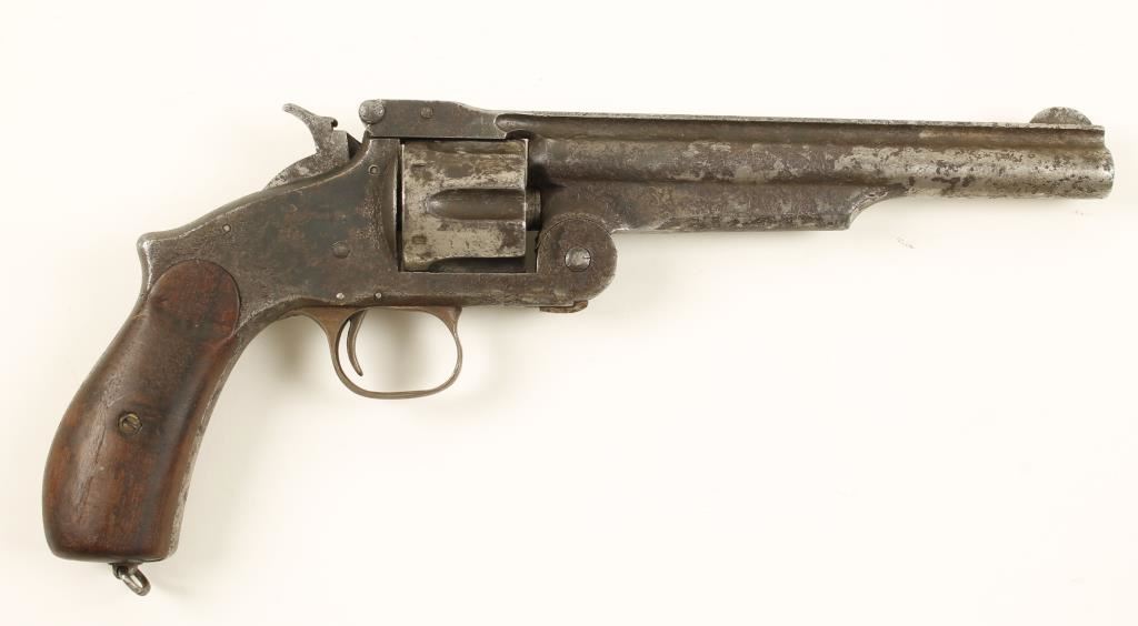 Commercial Model. Nickeled single-action 6-shot top-break revolver with a 7" barrel with top rib. Trigger guard is a replacement. Perhaps more than 10% of the plating remains and the exposed steel is heavily pitted with a black patina. Bore is primarily shiny with sharp rifling but has an area of pitting on the left side. Chambers are mostly shiny with areas of pitting. Missing screw on top strap and spring for barrel latch. Smooth grips have scratches and rubs. The number "103(?)" is stamped on the butt with what appears to be a triangle with something in it. Action rotates the cylinder and cocks the hammer but the cylinder can spin past the next chamber. Condition is poor. *Antique Firearm*