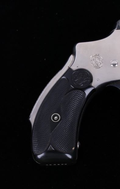 This is a Smith & Wesson 2nd Model Safety Hammerless "Lemon Squeezer" revolver chambered in .32 caliber. The revolver shows a nickel frame, cylinder and 3.5" barrel with factory black hard rubber grips. The barrel is marked "Smith & Wesson Springfield Mass U.S.A. Pat'd Feby 20. 77. Dec. 18. 77. May 11. 80. Sept. 11. 83. Oct. 2. 83. TWO Aug. 4. 85." The Safety Hammerless or Smith & Wesson New Departure is nicknamed the "Lemon Squeezer" because the safety must be squeezed in order to fire the gun. The revolver incorporated an internal hammer and an external grip safety on its backstrap. The double-action Safety Hammerless was produced from 1887 to 1940 with this example being from circa 1895 to 1905. The Smith & Wesson Safety Hammerless revolver is in good condition and has retained much of the original nickel finish. The bore is bright and rifling is crisp. Serial Number: 142955. This firearm qualifies as a Curio & Relic Long Gun, and requires FFL Transfer or NICS Background Check.