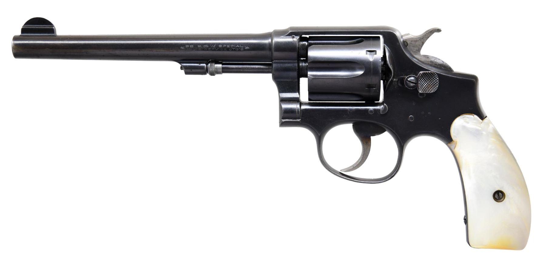 Cal. 38 Spl. S# 38795. Bbl. 6 1/2" pinned with integral 1/2 moon blade front sight; pinched U notch at rear of frame. Mfg. 1903-1904 (28,645 units) as 5 screw K frame with round butt. Trigger return spring is a leaf as is mainspring. Matching numbered frame, cylinder, extractor and barrel also having "B" for blued finish. Real pearl grips without medallions. Detent in yoke to assist holding yoke open for easier loading and unloading. Round knurled ejector rod head (in the white). Case colored smooth faced trigger and finely checkered hammer. CONDITION: good overall appearance with factory quality refinish over light prior pitting on frame. Pin prick oxidation on trigger and hammer. Hint of cylinder turn line. Near excellent right grip; left has some small chips at top. Light trigger return spring function. Replaced firing pin with retaining pin having non-factory quality installation. Near excellent bore. PPROVENANCE: From the Lifelong Collection of George Staden S&W Member #3451. (25-43/NW). CURIO. $350-500.