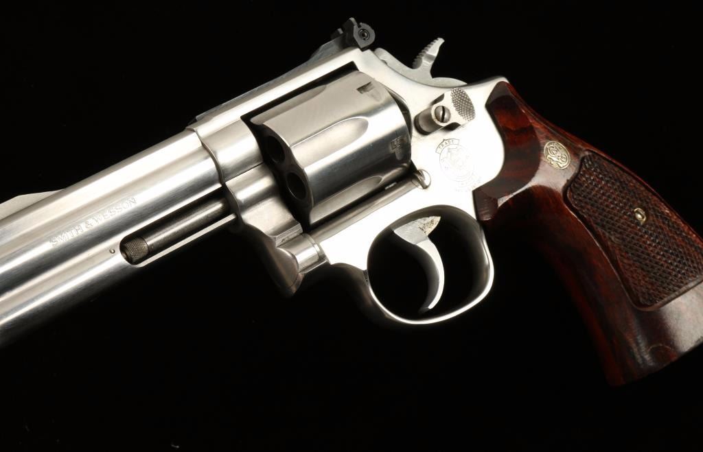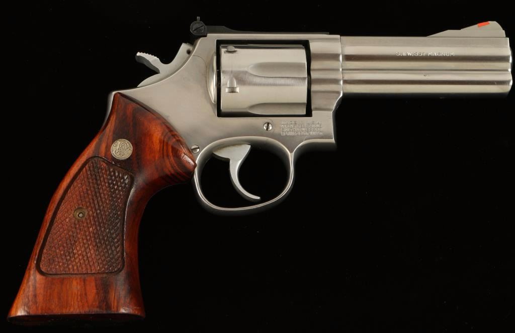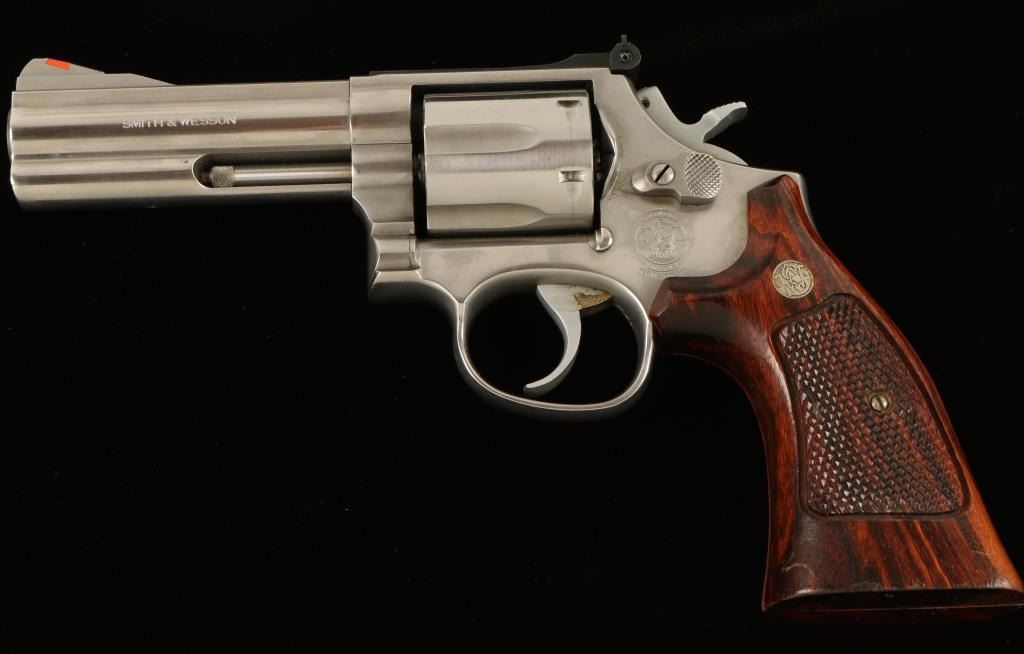 Polished and matte finish stainless steel 6-shot double-action revolver with a full underlug 4-1/8" barrel, combat front ramp sight, adjustable rear blued sight, checkered wide spur hammer, smooth face wide trigger, and magna grips with checkered panels. there is a moderate drag line on the cylinder. Bore is bright with sharp rifling and the chambers are bright and shiny. Lock-up is almost rock solid. Action is smooth. Grips have a few small scratches in the finish. Condition is excellent. *Modern Firearm*
