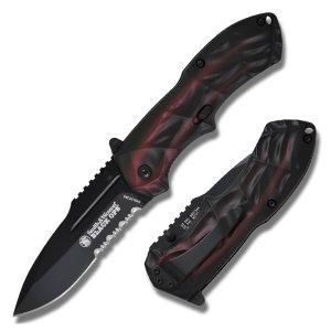 Long Description Asssited knife with 3.4 in. 4034 stainless steel with red 4.3 in. handle. Thumb knob, finger actuator, liner and safety locks. Features Blade Length: 3.35 in. Overall Length: 7.65 in. Blade Material: 4034 steel Handle Material: aluminum