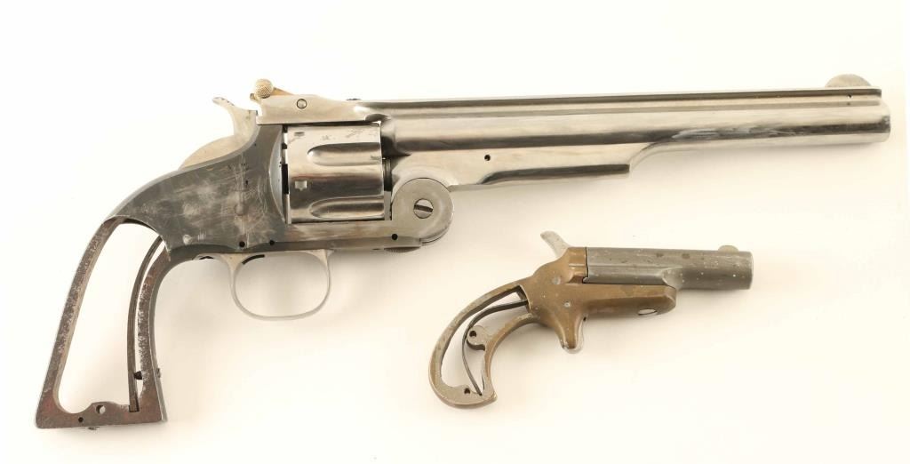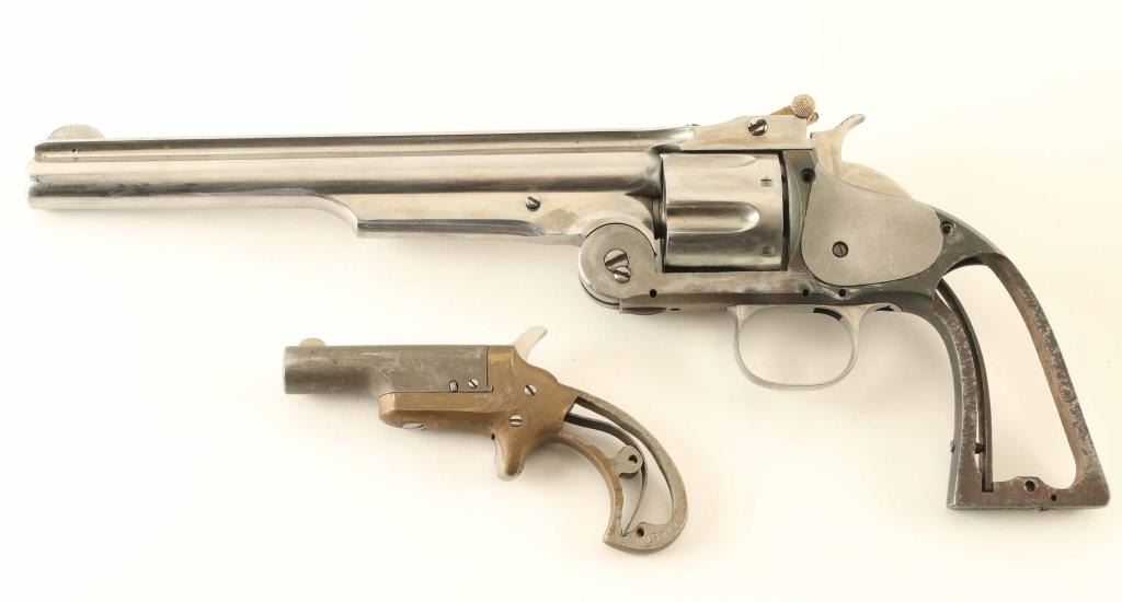 Colt Derringer .41cal 13711 no finish no grips some missing parts seems to partially work. In NRA Poor condition. S&W REPRO Schofield .45?? SN16485 includes barrel, part of the action, no grip and is completely in white raw metal. NRA poor Antique Firearm