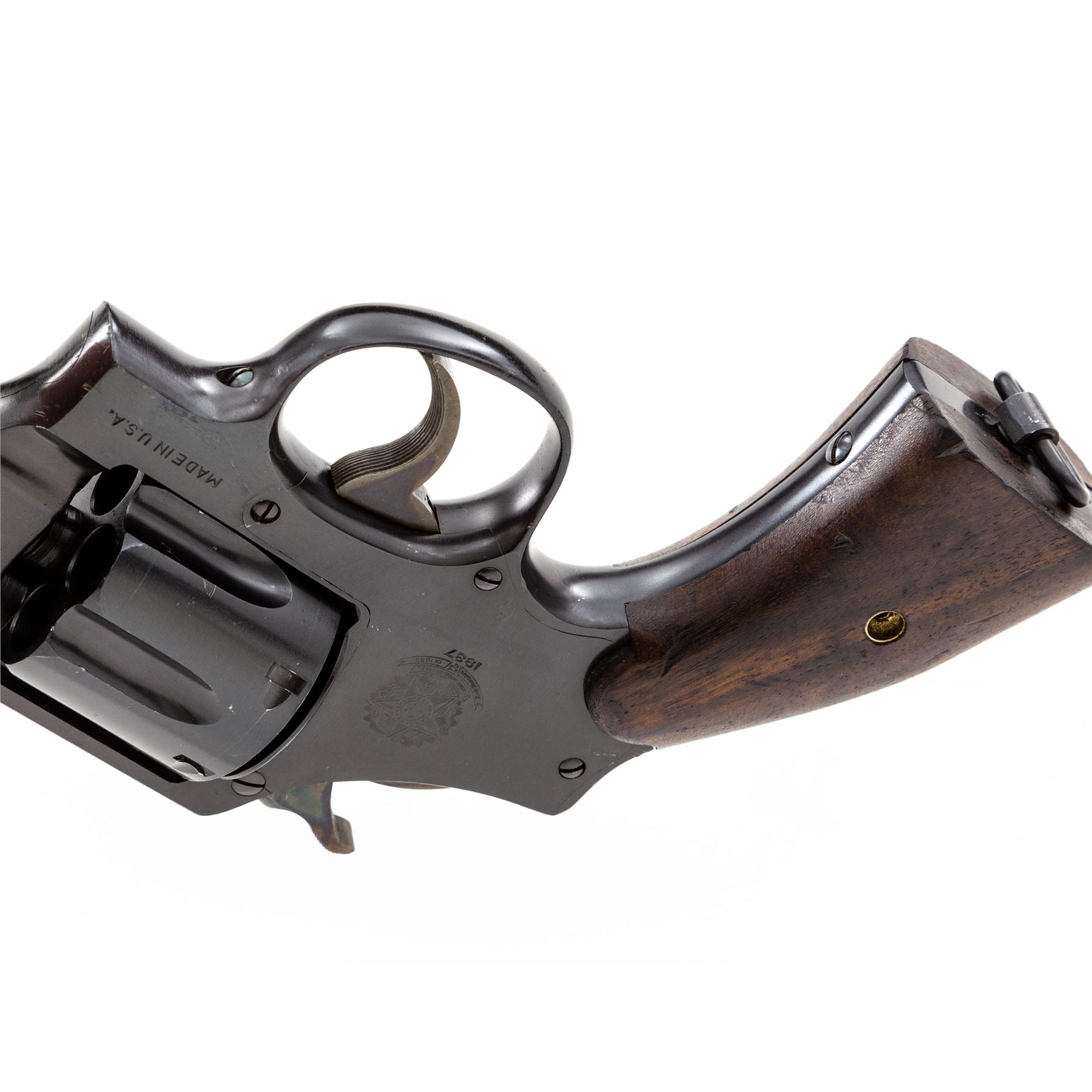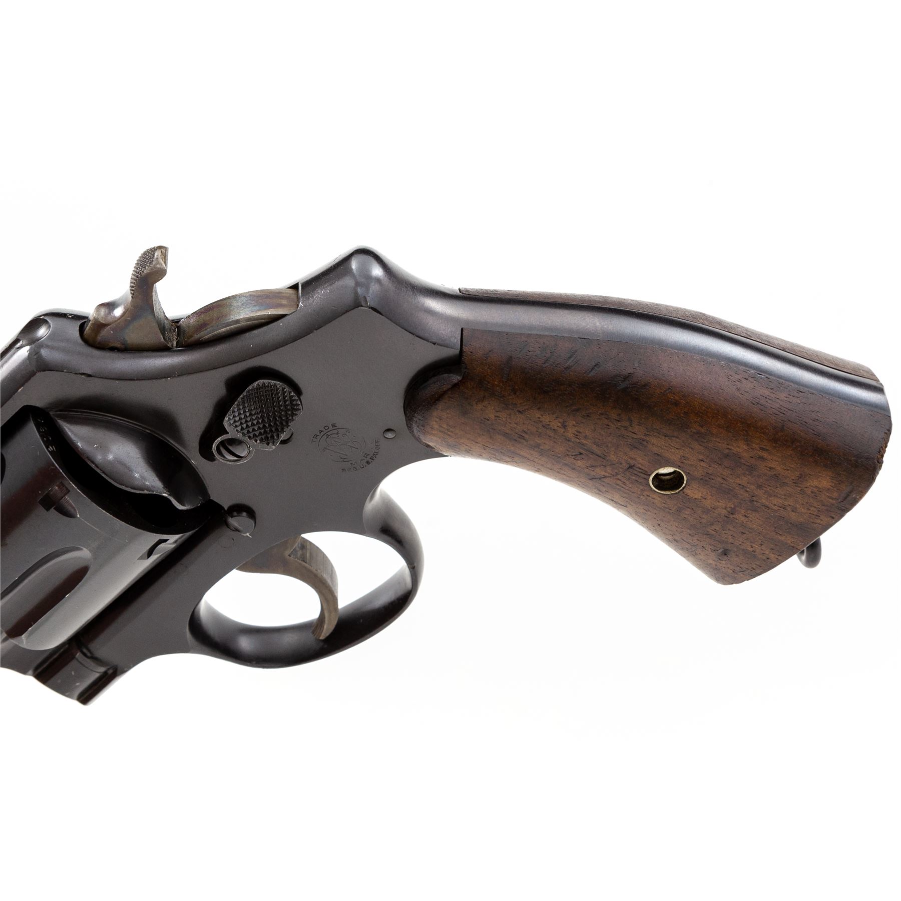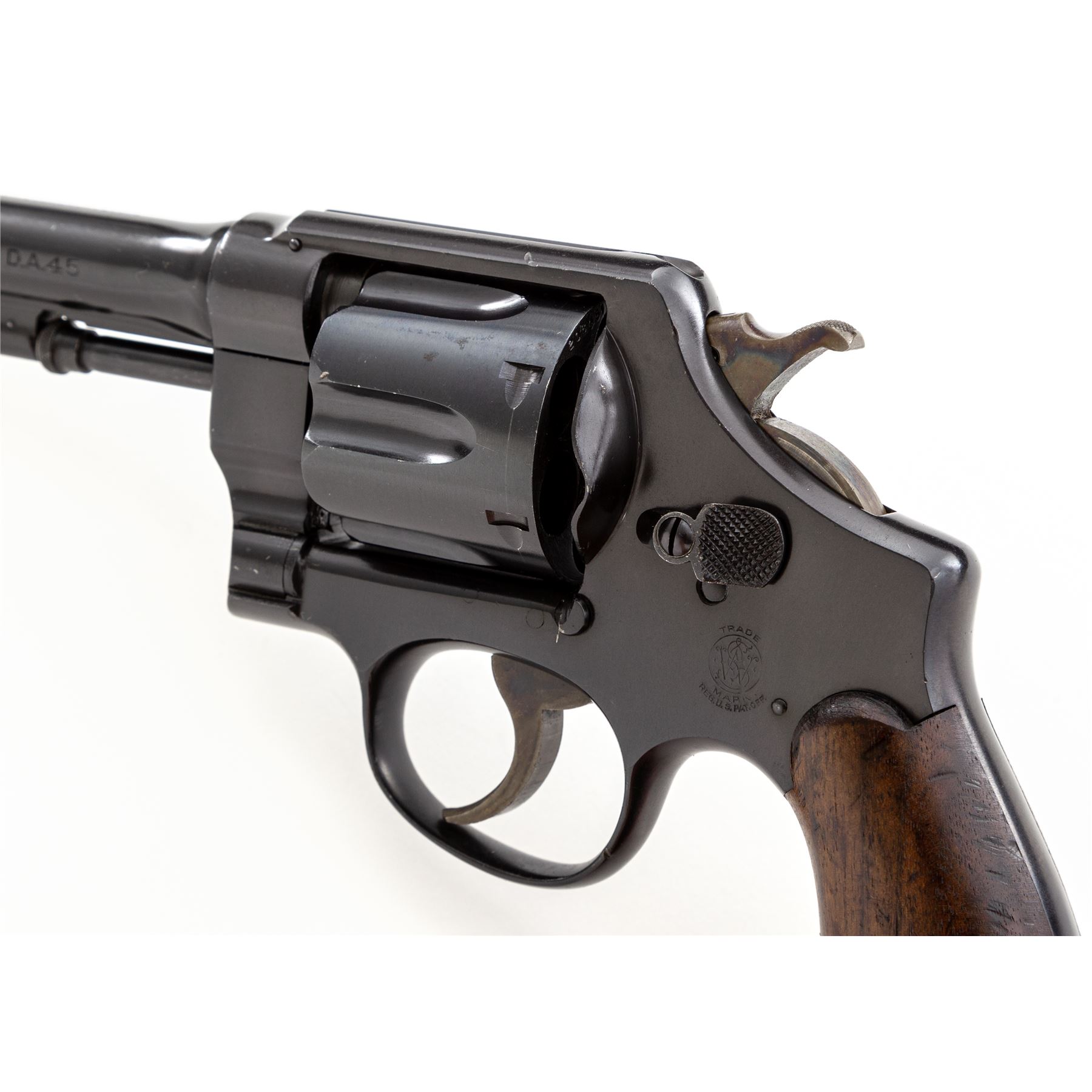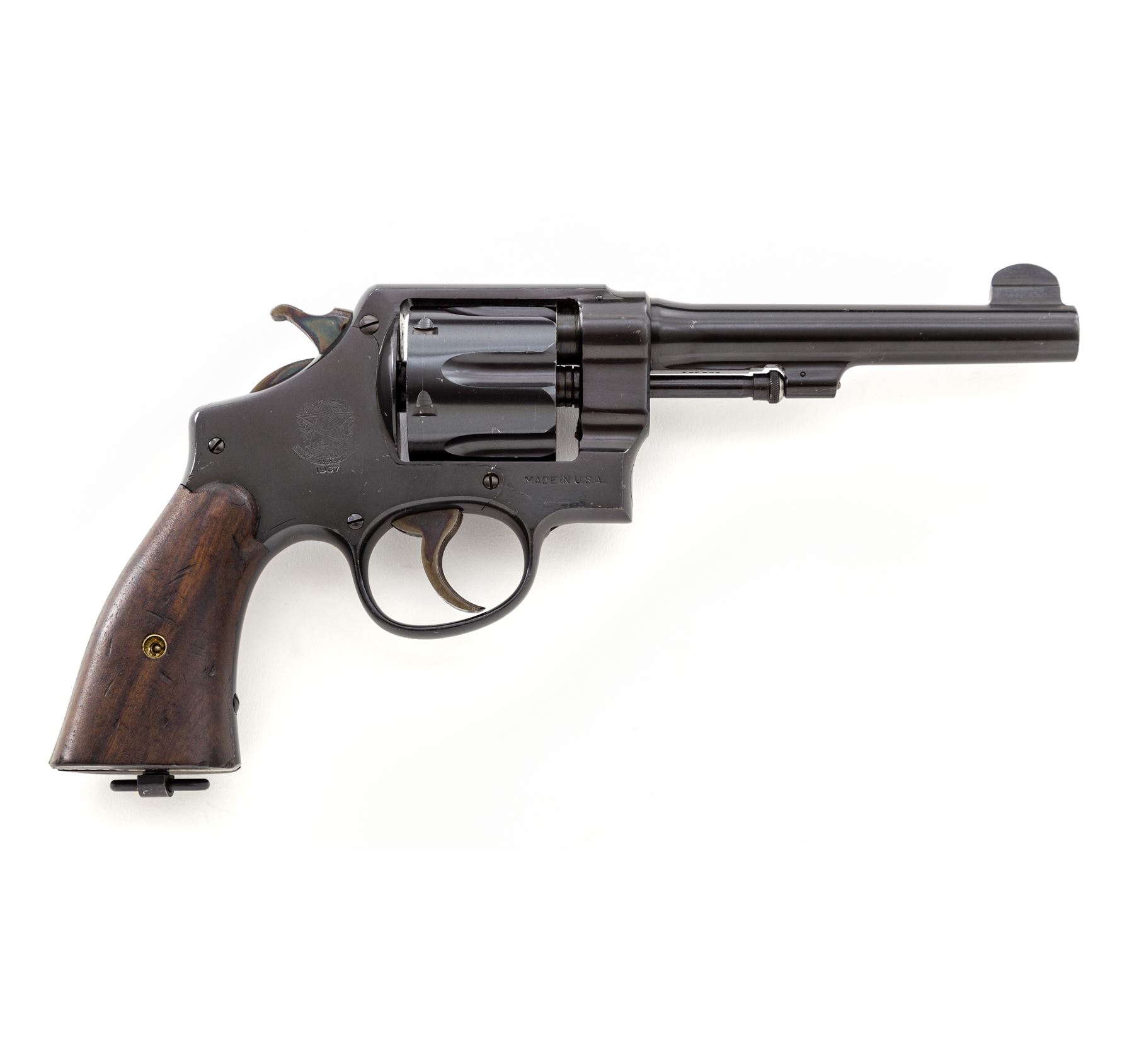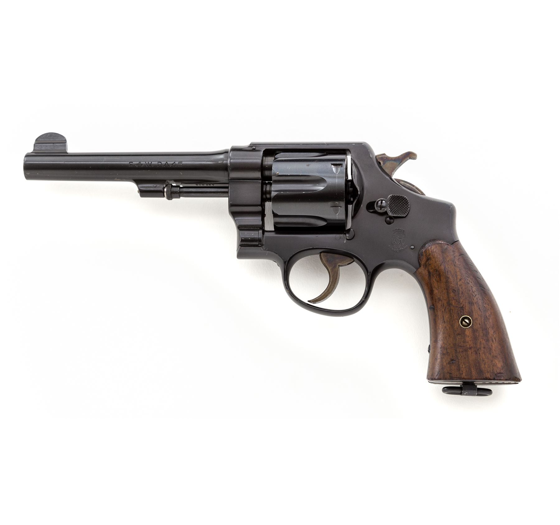 Smith & Wesson Commercial Model 1917 Double Action Revolver, #208451, .45 ACP cal., 5.5'' barrel, blue finish, smooth factory military walnut grips with matching numbers inside right panel, lanyard loop in butt, sideplate with Brazilian crest (1937). Shipped April 1, 1946 to John Black, New York, for Brazil. One of 25,000 Model 1917s made for the Brazilian government. Condition is excellent retaining approx. 99% original finish, with very light general marks from handling. Grips with light scattered impressions. Good action, bright bore. One of the nicest examples of a Brazilian Commercial 1917 we have seen. Est.: $1,000-$1,500. (C&R/PPT)
