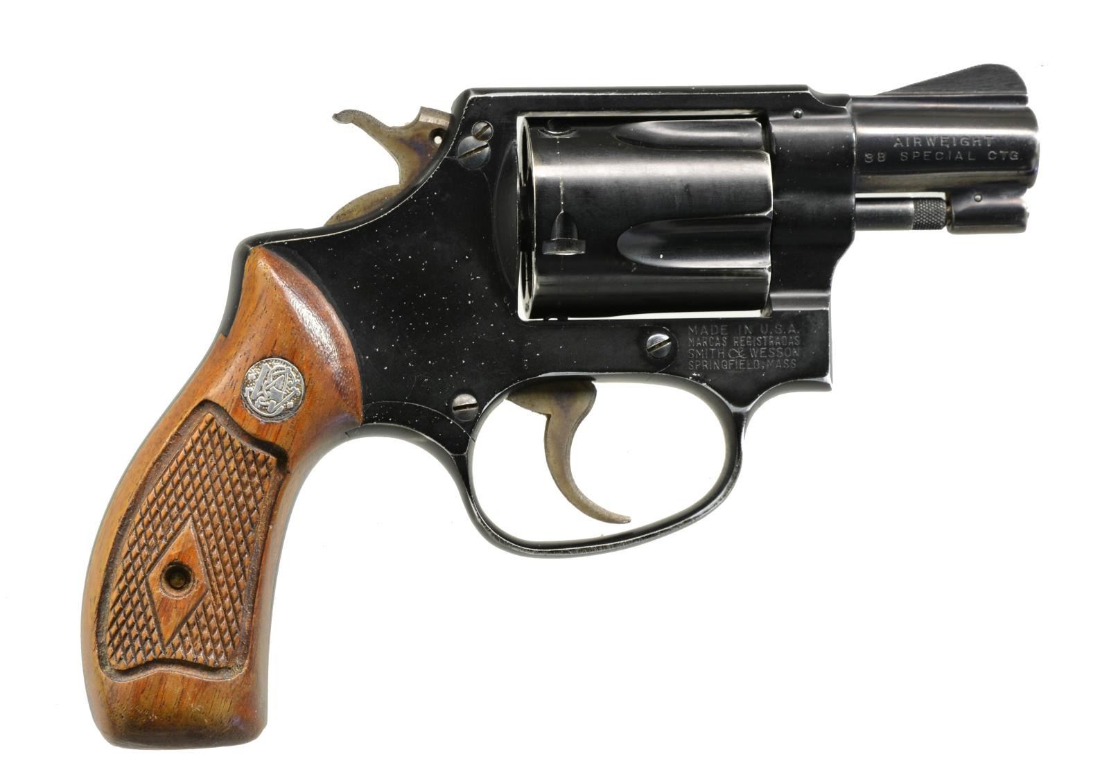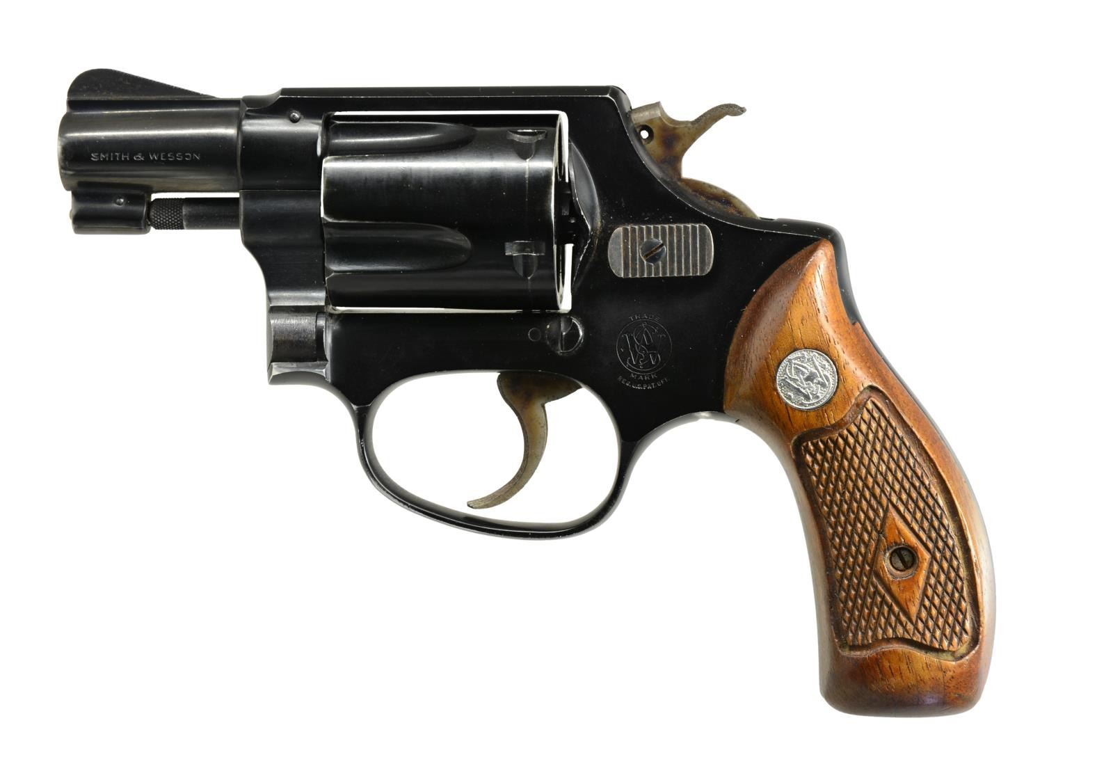Cal. 38 Spl. S# 28821. Bbl.1 7/8". Mfg. 1953 w/ rare early production alloy cyl.; approximately 3,777 units. All correct early rnd. butt J frame features including flat latch, pinned bbl. & 4 screw sideplate w/ top screw having extra retaining screw. Standard case colored hammer & trigger. Matching numbered bbl., cyl., extractor & diamond center checkered walnut Magna grips. CONDITION: good to very good appearance w/ high edge wear, faint turn line & some speckled appearances such as on sideplate & underside of frame. Very good grips w/ faint marks at bottom of right. Faint firing residue in action. Peppery oxidation on hammer & trigger. Near excellent bore. Especially rare example w/ premium producing alloy cyl. (20-2197/NW). CURIO. $700-1,000.