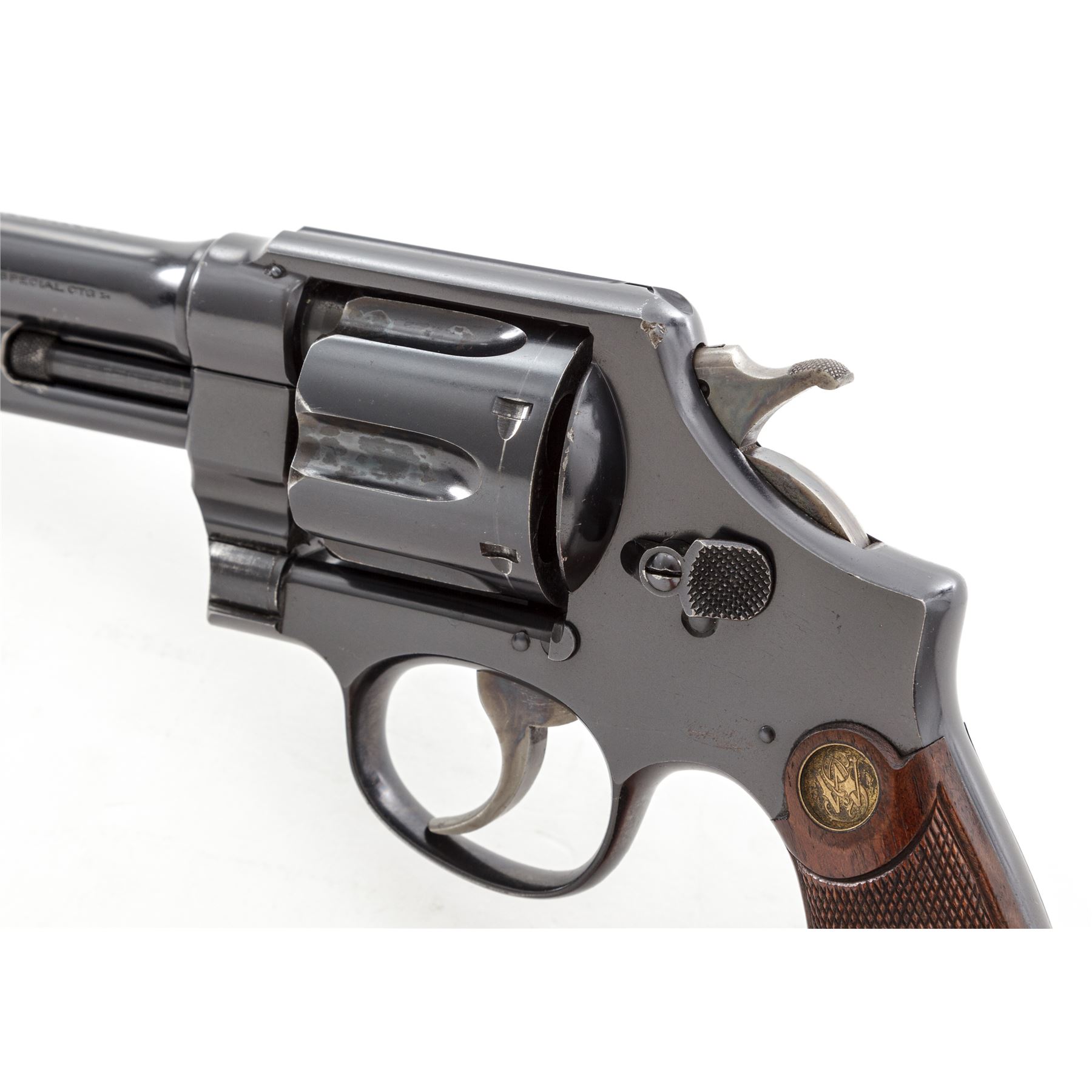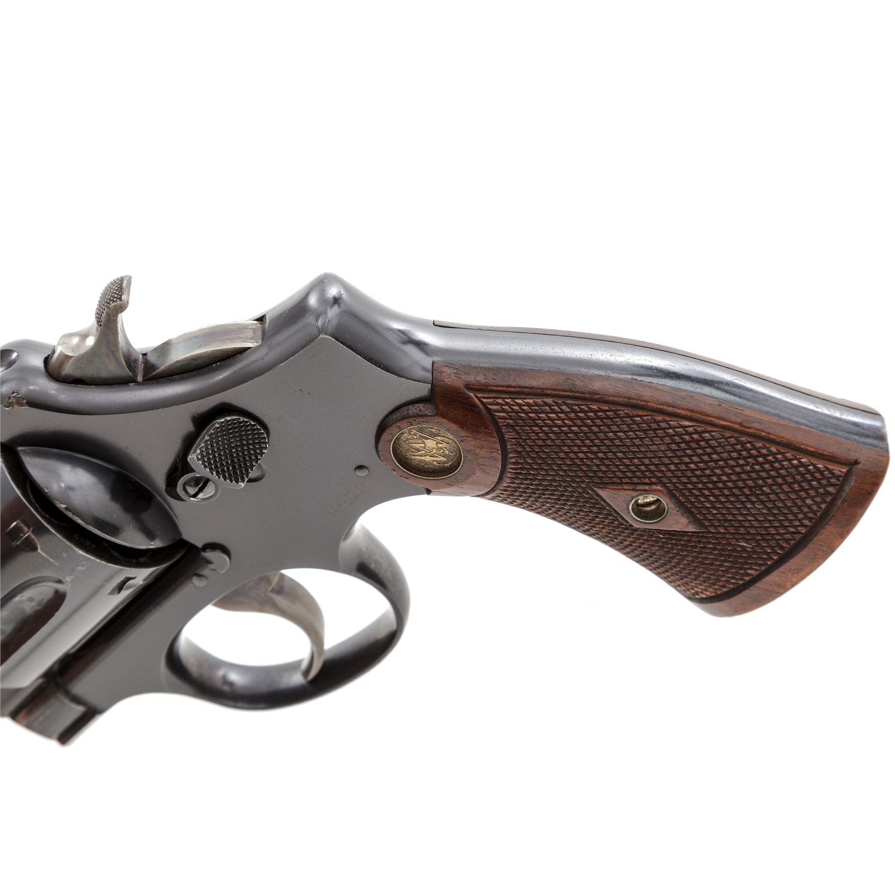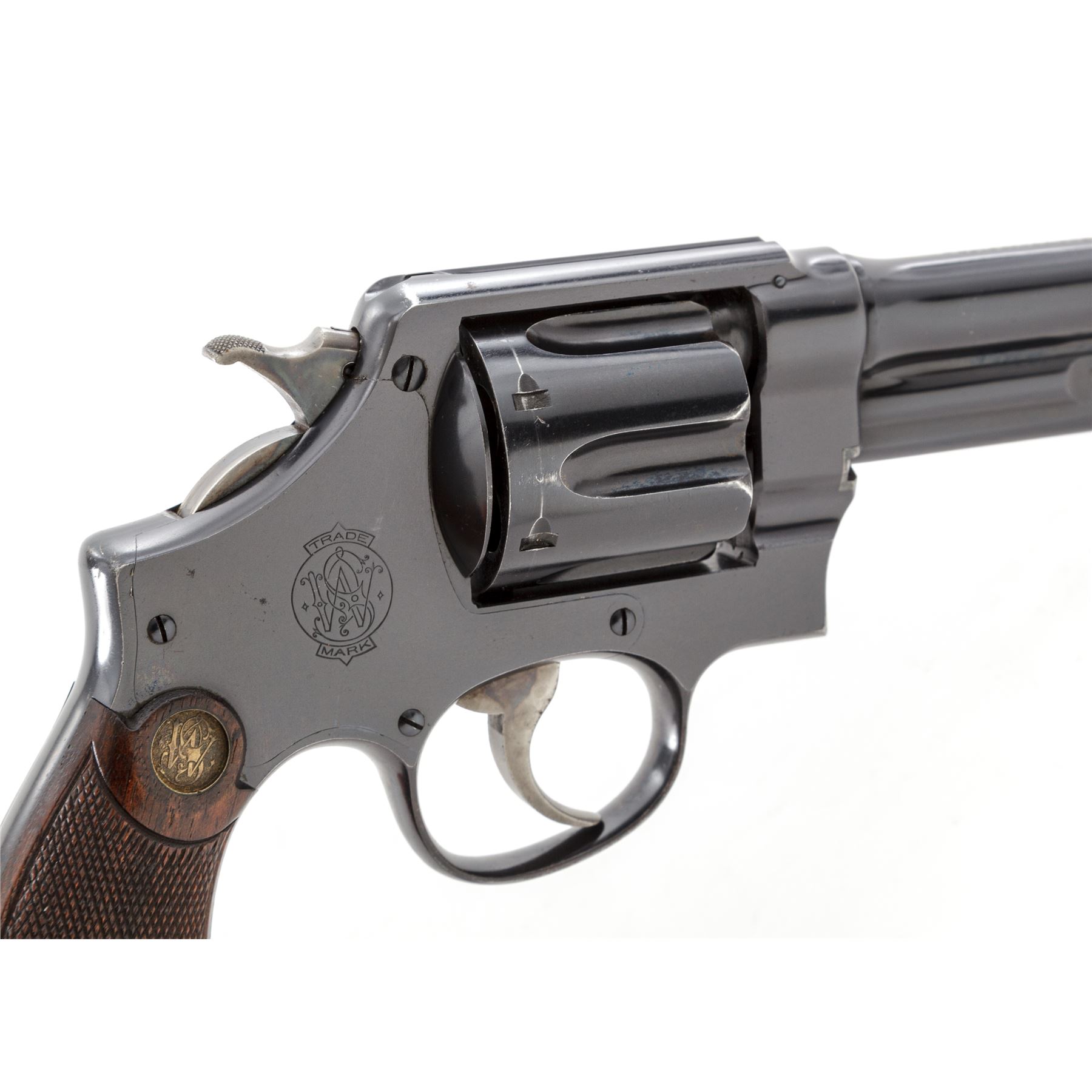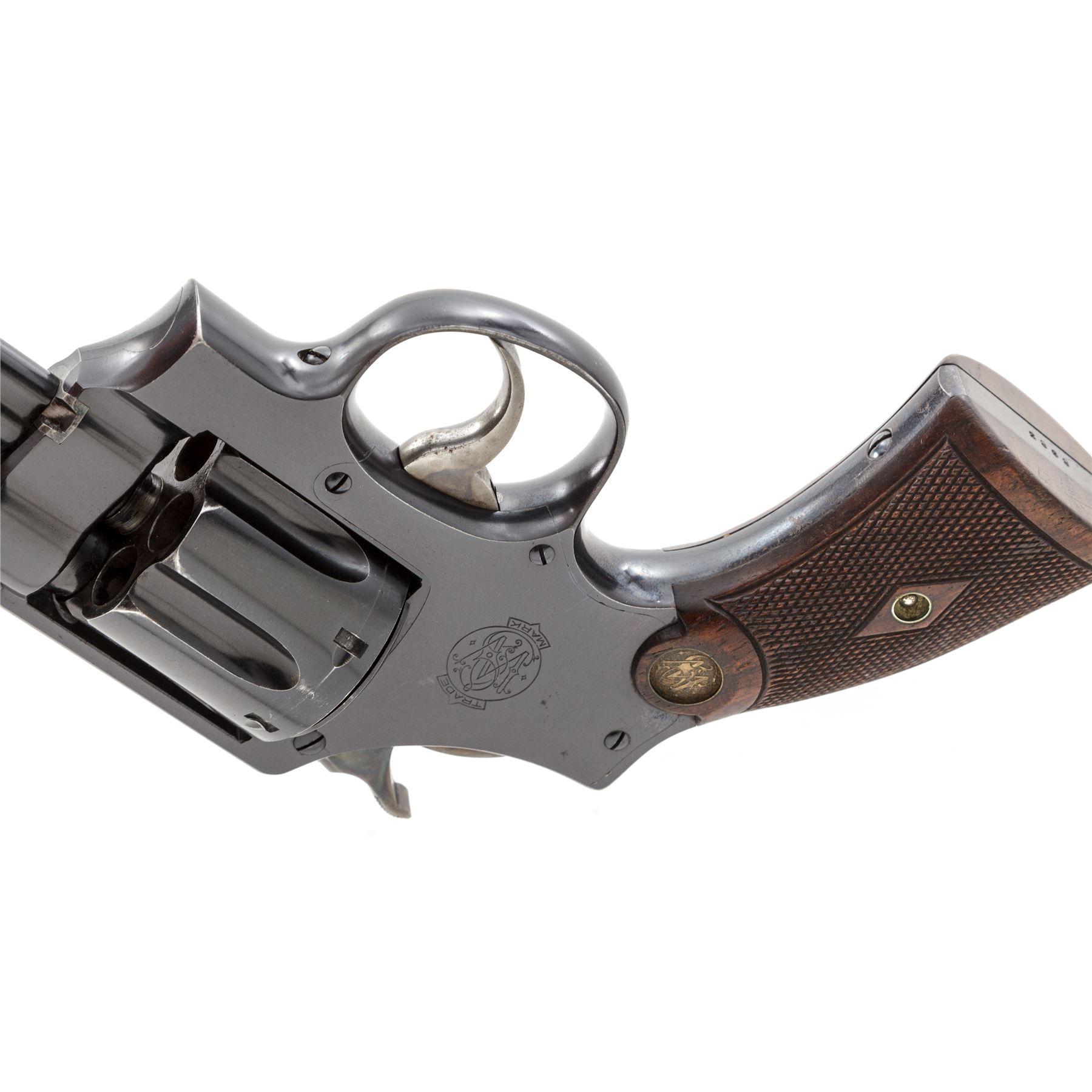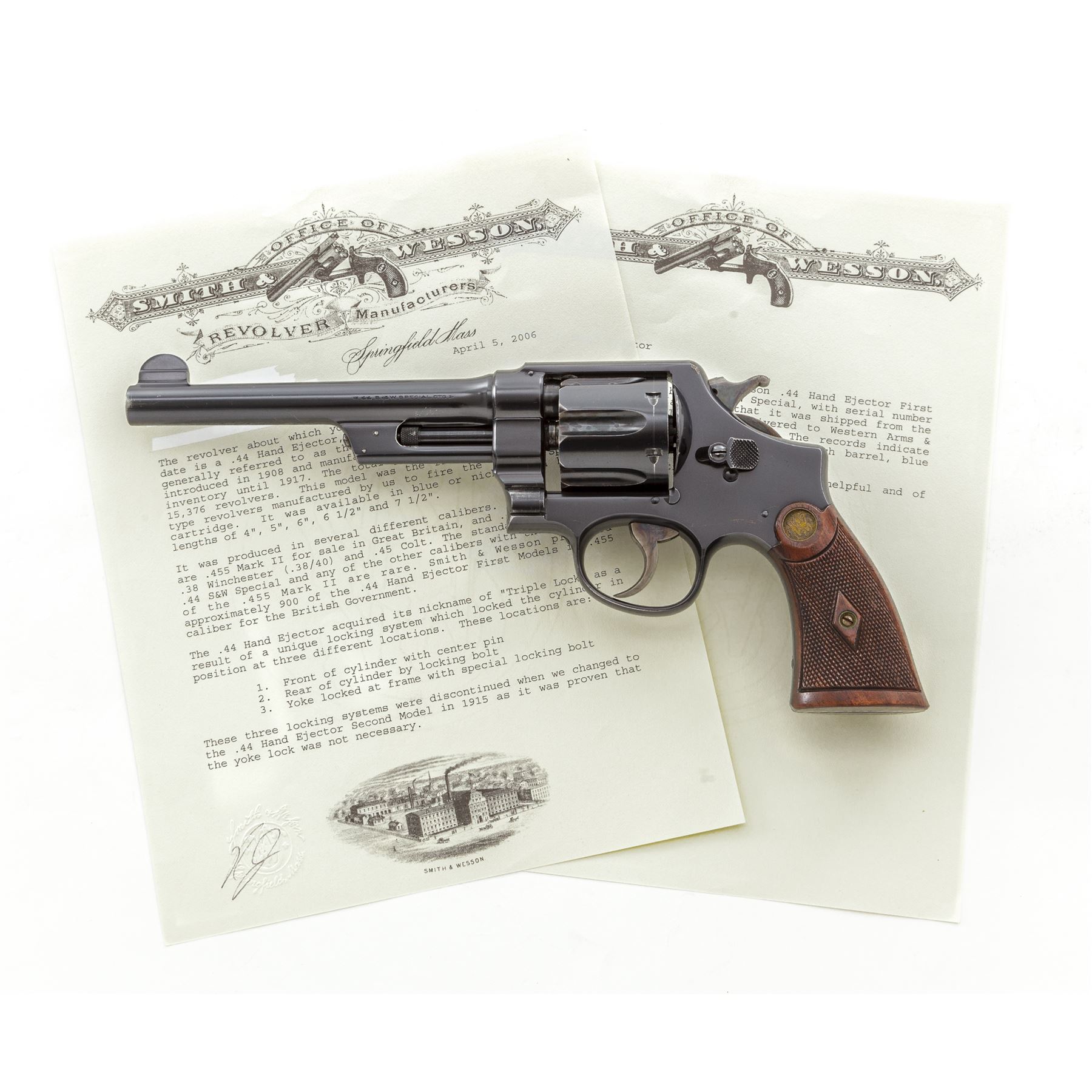 Smith & Wesson First Model Hand Ejector Triplelock Double Action Revolver, #8983, .44 S&W Spec. cal., 6.5'' barrel, blue finish, matching numbered checkered walnut grips with S&W medallions. Shipped Aug. 25, 1914, to Western Arms & Sporting Goods Co., Salt Lake City, UT, with factory letter signed by S&W Historian Roy G. Jinks. Condition is excellent retaining approx. 97% original factory high polish blue, with light wear at muzzle, as well as light flaking in cylinder flutes, with very light index mark to cylinder. Small ding near back of topstrap left side. Grips and action are crisp, bore is mirror bright. Est.: $2,000-$3,000. (C&R/PPT)