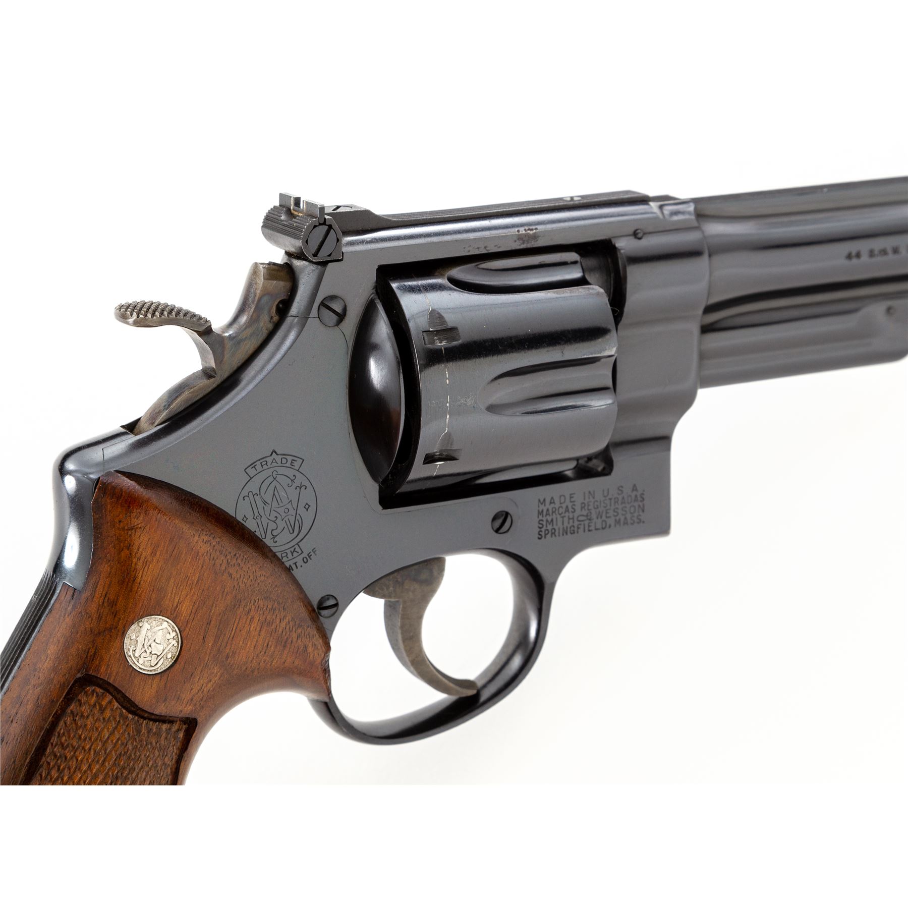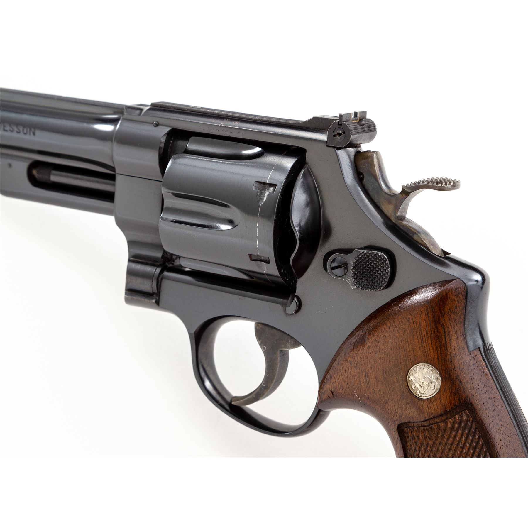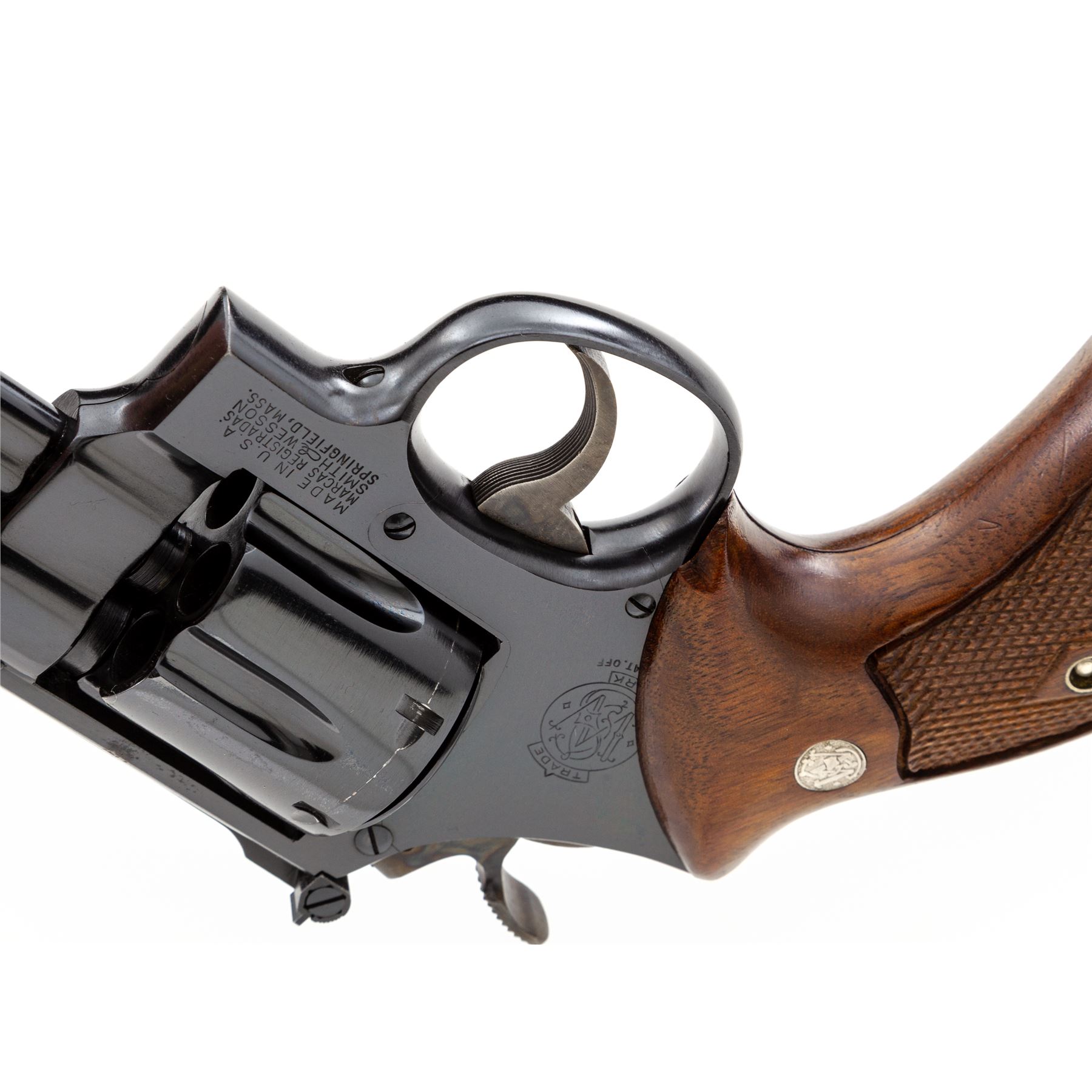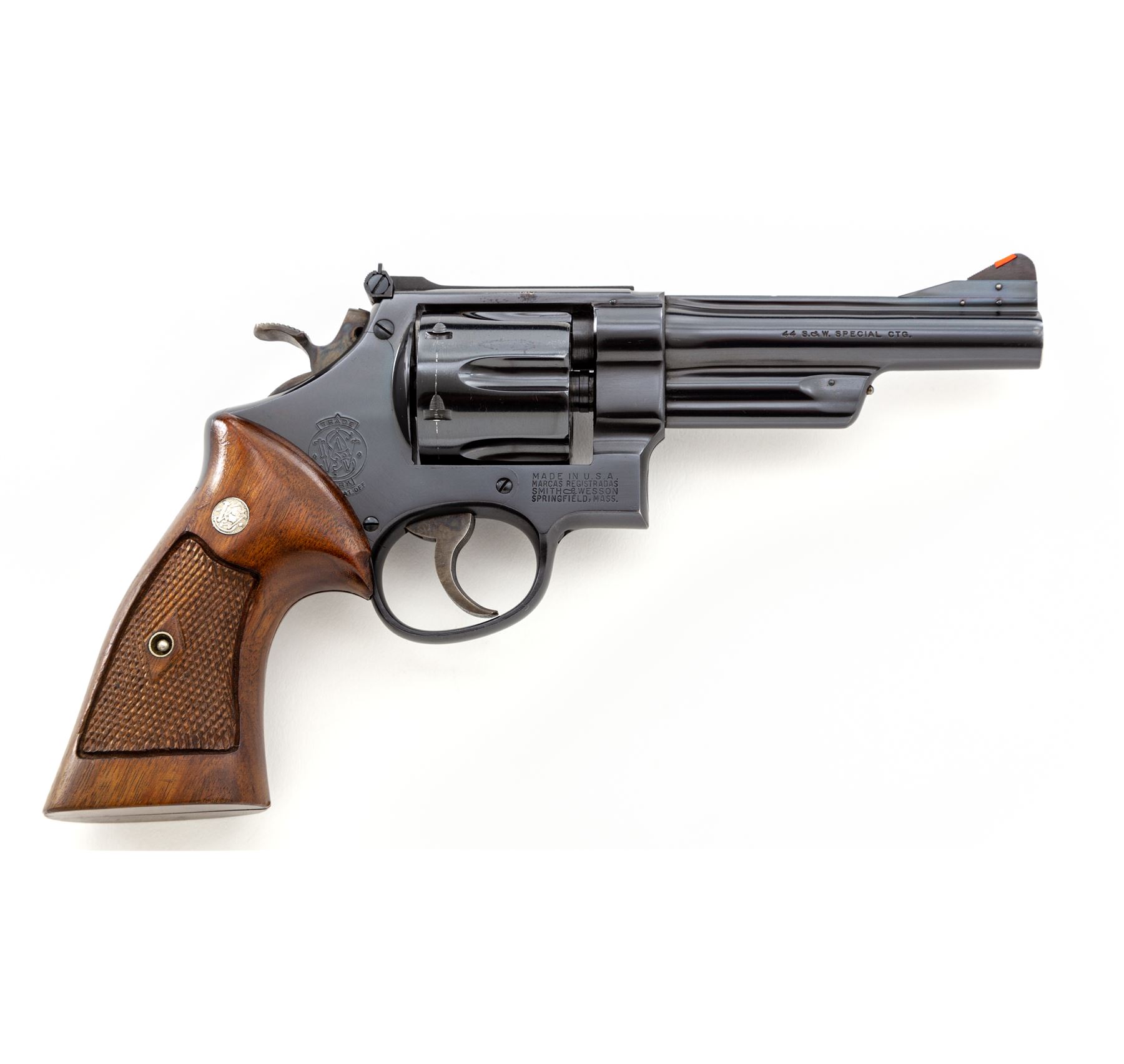 Smith & Wesson Fourth Model Hand Ejector (Model of 1950) Target Double Action Revolver, #S141946, .44 S&W Spec. cal., 5'' barrel, blue finish, unnumbered target walnut grips, target hammer, red ramp front sight and white outline rear sight. Shipped Oct. 21, 1955, to Kirkwood Bros., 23 Elm St., Boston, Mass., with factory letter signed by S&W Historian Roy G. Jinks. Condition is near excellent with approx. 96% original factory blue, with thinning at muzzle, and one area of cylinder showing discoloration from storage. Grips and action are excellent, bore is bright. Est.: $1,200-$1,800. (C&R/PPT)