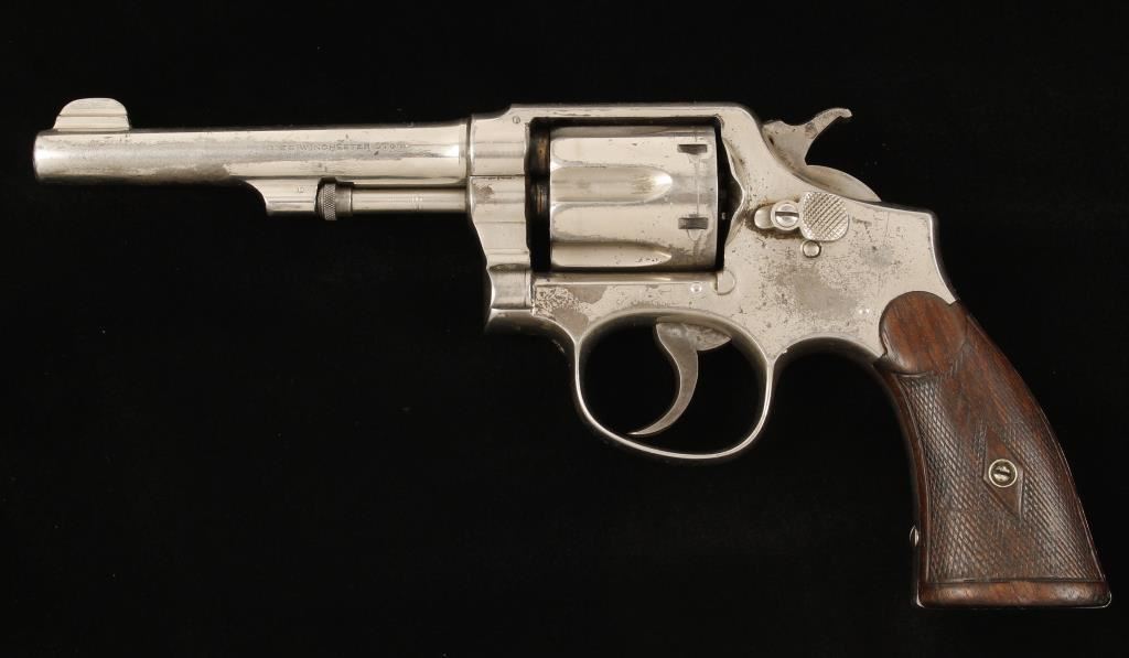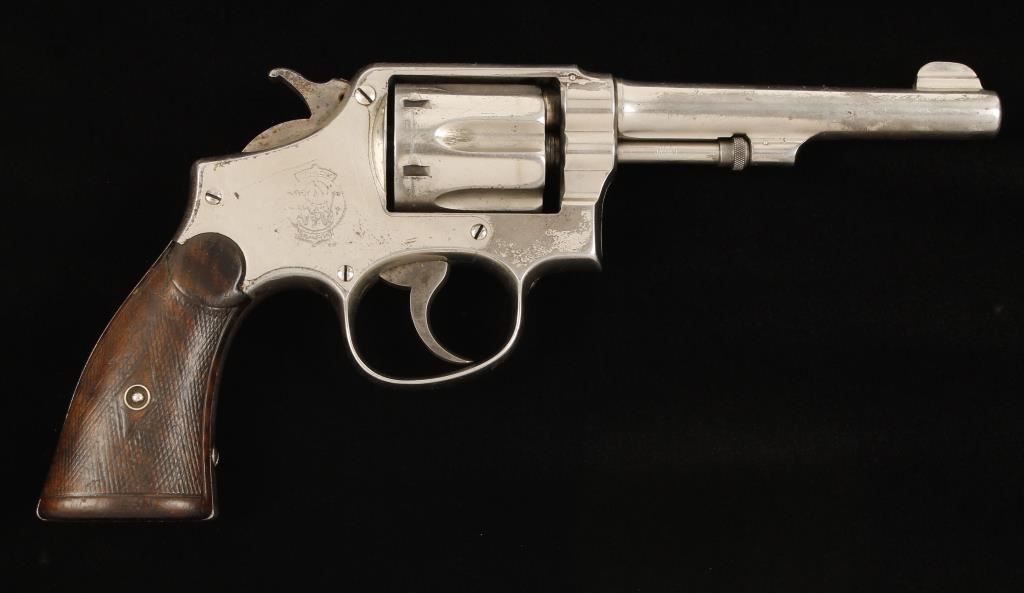 2nd Change. Nickel plated double-action 6-shot revolver with a 5" barrel. Finish is worn through to steel in many places with dings and rust spots showing on grip straps. Bore is shiny with good rifling. Chambers are fine. Functions well with good lock-up. Checkered wood grips without medallions have dings, are worn smooth in areas and have a small chip missing but are complete. Condition is fair to good. *Modern Firearm*