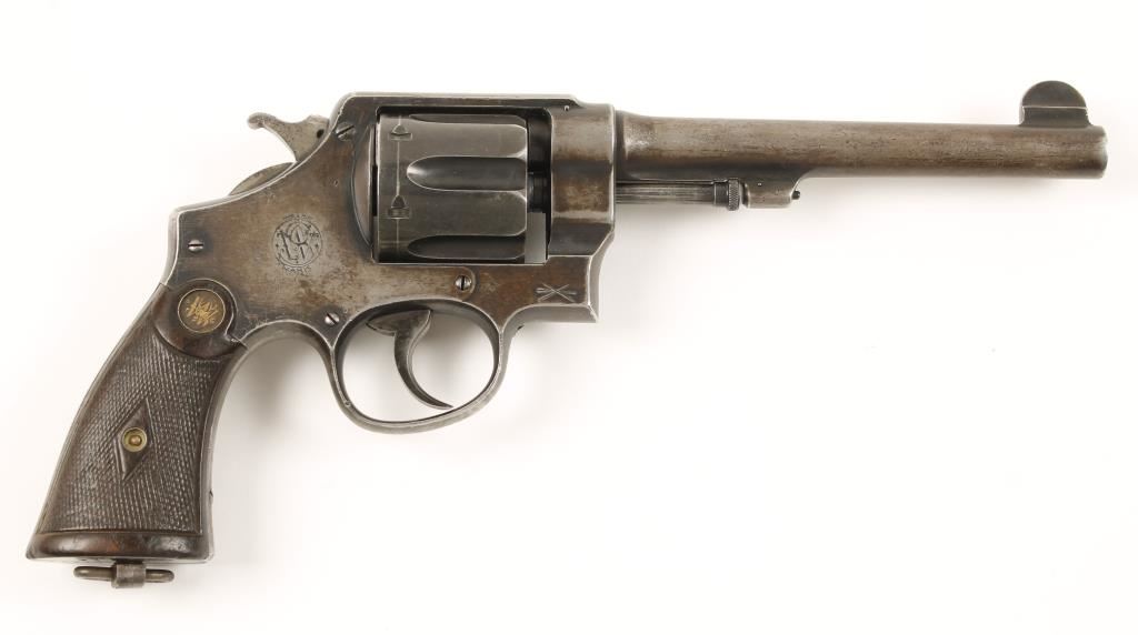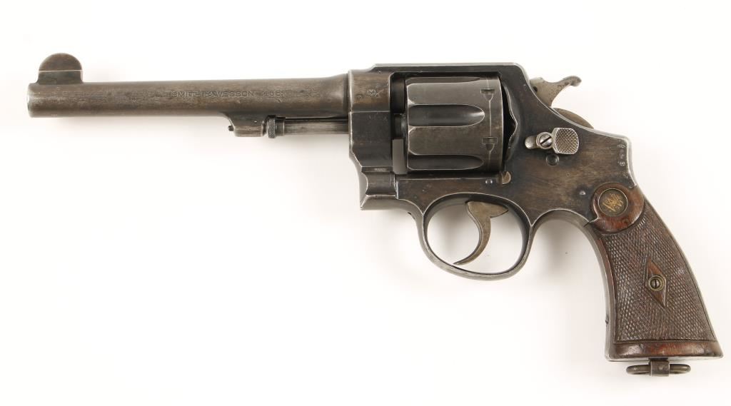 Blued double-action 6-shot revolver with a 6-1/2" barrel. British military proofed. 2nd model hand ejector. Finish is worn to a mottled grey/brown on exposed areas. There is edge wear and the grip straps are worn to metal. The cylinder has a drag line. The action is smooth and works well with tight lock-up. Roll-stamps are sharp and clear. The bore is shiny and bright. The chambers are good. The checkered wood grips have brass medallions but are worn with no points on the checkering. Condition is good. *Modern Firearm*