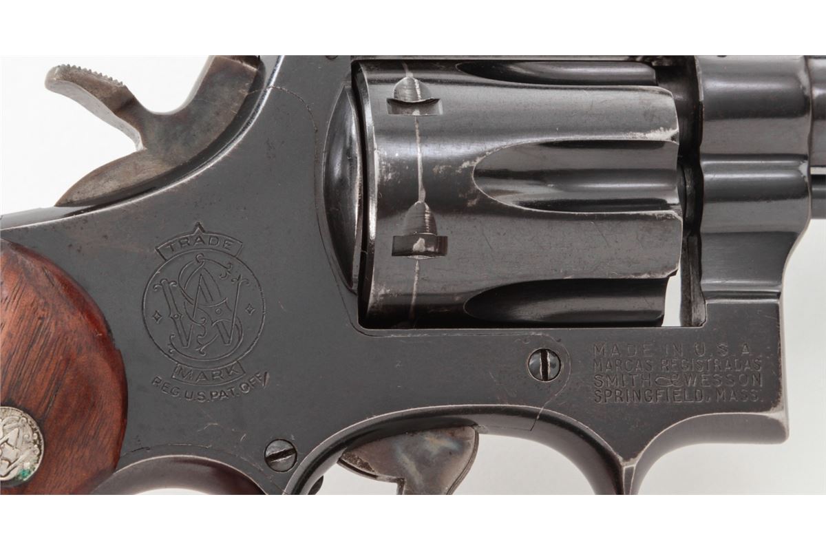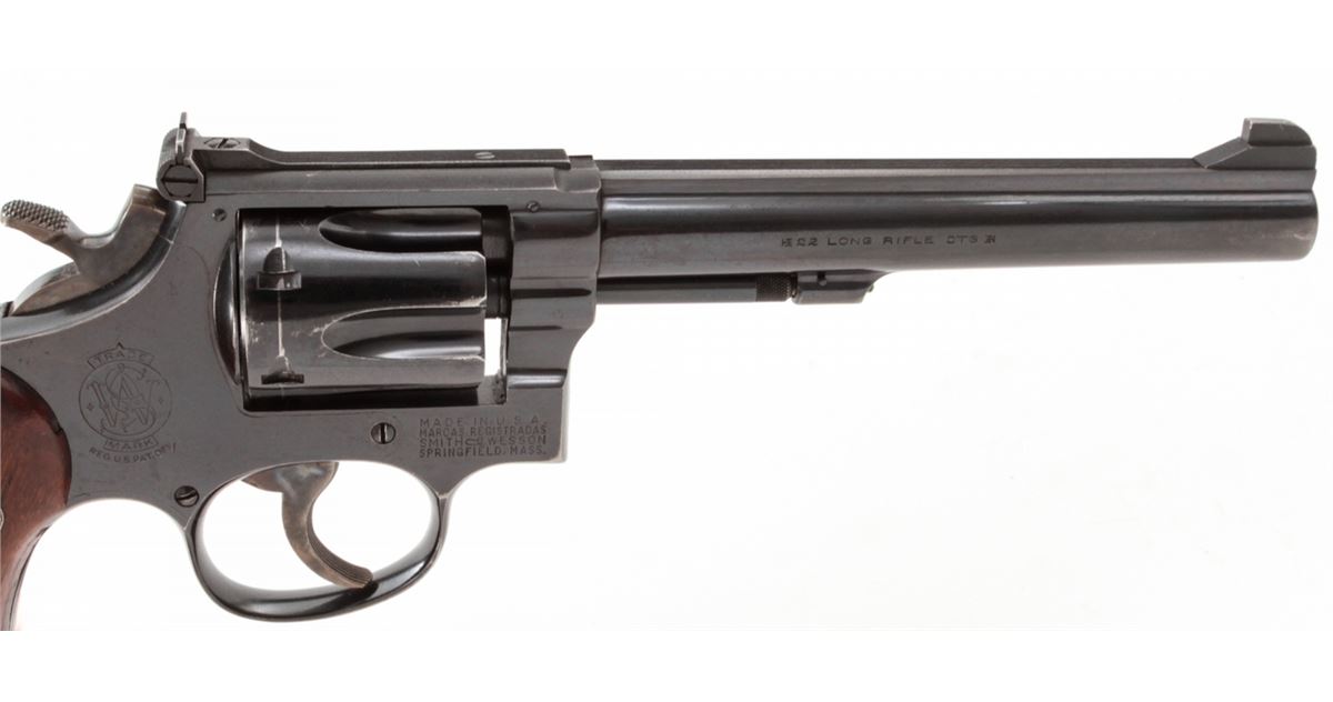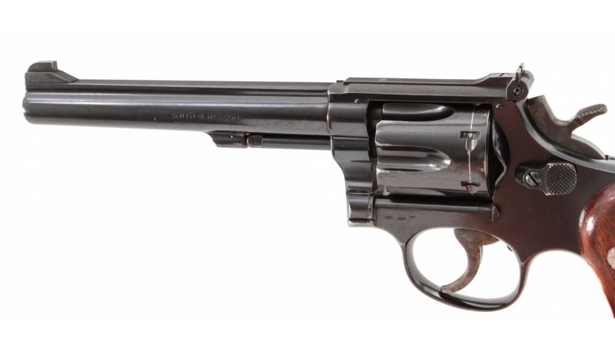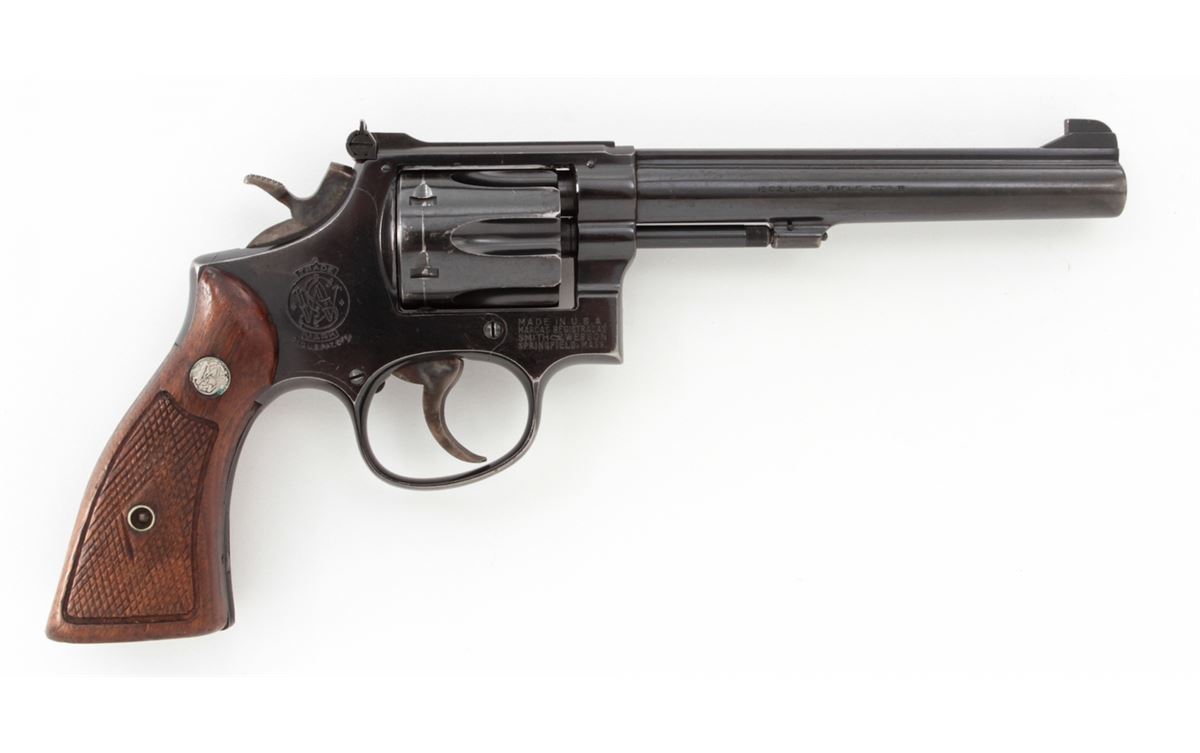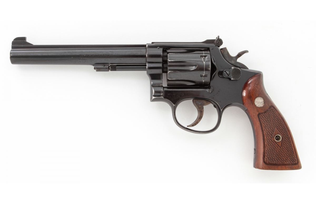 Smith & Wesson K-22 Double Action Revolver, #308721, .22 LR cal., 6'' barrel, blue finish, factory checkered large diamond walnut grips with S&W medallions. Condition is fine retaining approx. 92% lightly thinning blue. Grips show mild flattening. Action is good, bore is bright. Est.: $350-$500. (C&R)