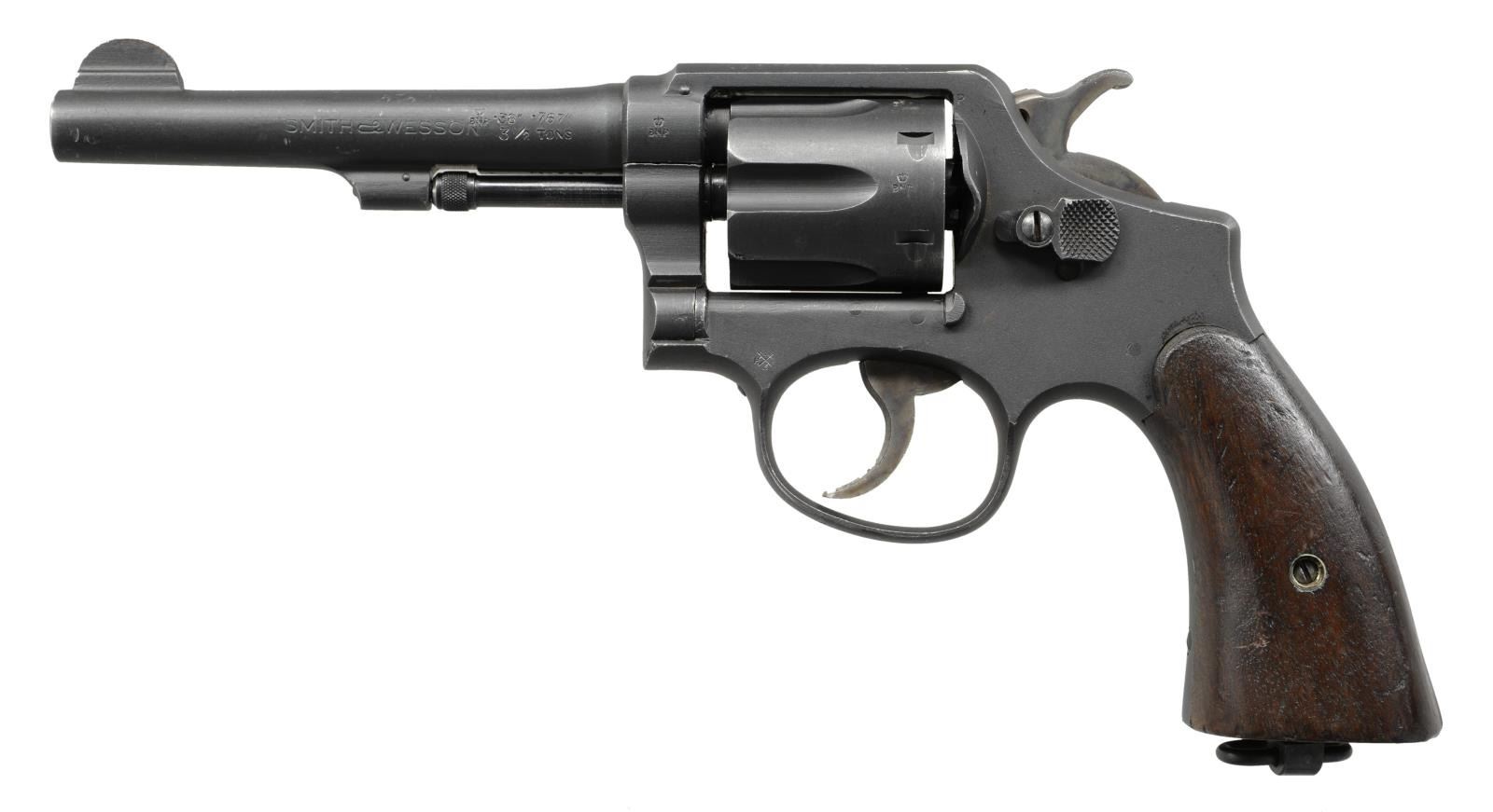 SERVICE REVOLVER. Cal. 38/200 (38 S&W). S# V 718595. Bbl. 5" pinned with matching number and integral circular sight blade; frame notched rear. Mfg. 1940-1945 for US Military use in 38 Special plus for Lend-Lease Program to assist Great Britain and Canada in 38/200 (British specified 38 S&W having 200 grain bullet). In addition to British proofs, top strap is marked "UNITED STATES PROPERTY". Matching numbered cylinder and extractor. Case colored grooved trigger and checkered hammer. Smooth walnut matching numbered grips plus lanyard swivel in butt. Numbered within range of Victory Models that were for US Military use. Most were Black Magic finished. CONDITION: good to very good appearance with light marks and high edge wear. Finish appears refinished to parkerized. Good grips with numerous light marks. Fine mechanics and near excellent bore. (23-1545/NW). CURIO. $350-500.