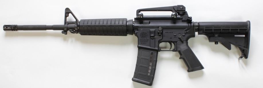 S&W M&P 15 .223 cal SN SR55887 semi auto rifle 18" barrel with collapsible stock and 30 round magazine shoing very good with little use. FFL/Modern. Est. 375-600semi auto rifle 18" barrel with collapsible stock and 30 round magazine shoing very good with little use. FFL/Modern. Est. 375-600