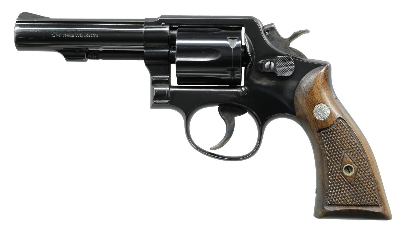 Cal. .38 S&W Spl. S# C694861. Bbl 4". Blued finish w/ case color hardened trigger and hammer. Matte blued top strap. Frame is mounted w/ 2 piece S&W medallion checkered wood grips. Serrated ramp front sight w/ frame notched rear sight. CONDITION: metal components retain the majority of their original factory blue finish, exhibiting some mild wear and thinning at the muzzle, w/ a few scattered superficial marks. Mirror bore w/ well defined rifling throughout. Grips show some minor marks from handling and storage, but are otherwise sturdy and serviceable. (23-1365/MLW). MODERN. $300-500.